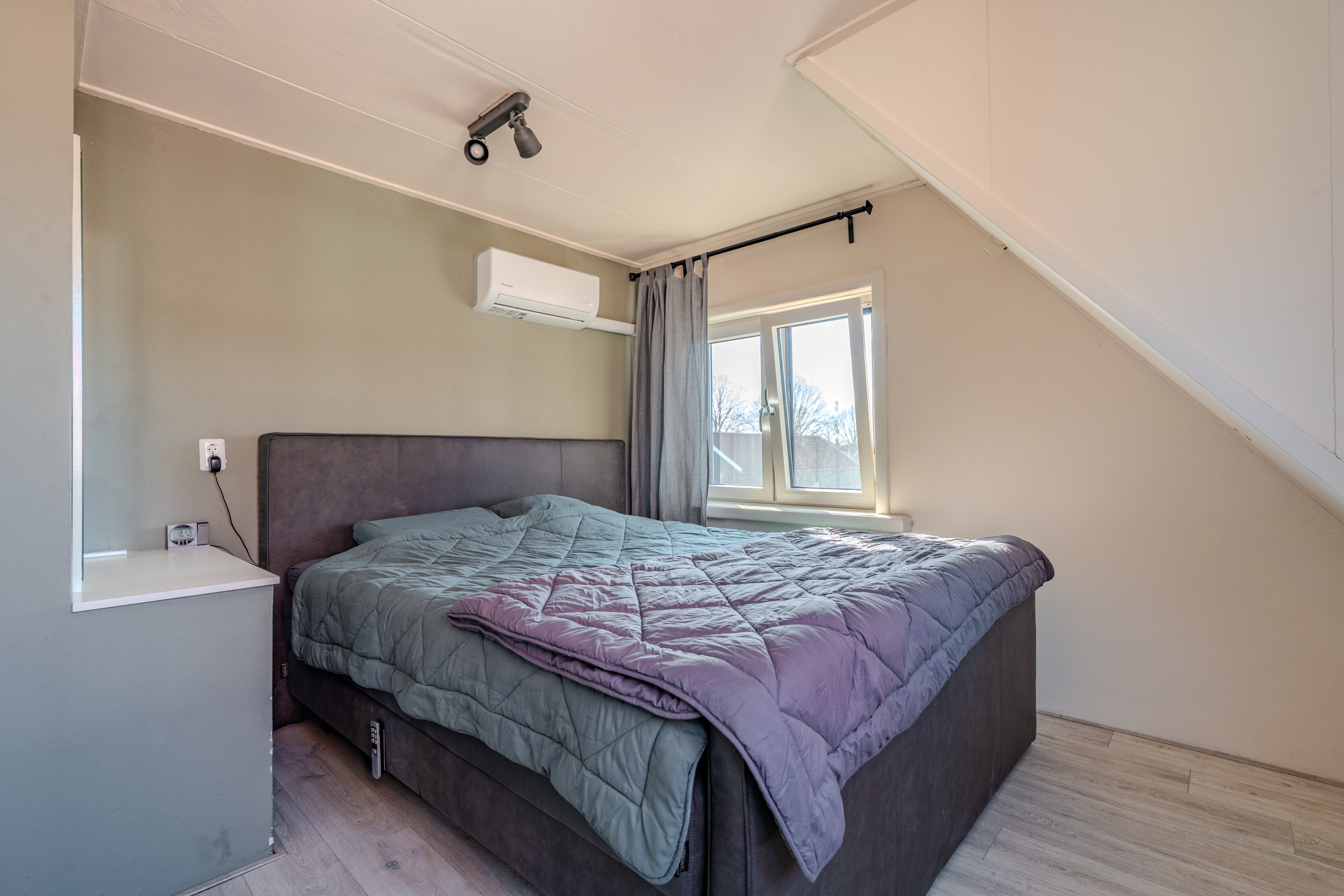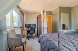 Middels de open trap in de woonkamer komen we op de overloop welke is voorzien van een vaste trap naar de vliering en de twee slaapkamers beiden voorzien van dakkapel met kunststof kozijnen en rolluiken, waarbij de master bedroom aan de achterzijde tevens is voorzien van een luchtwarmtepomp voor verwarmen en koelen.