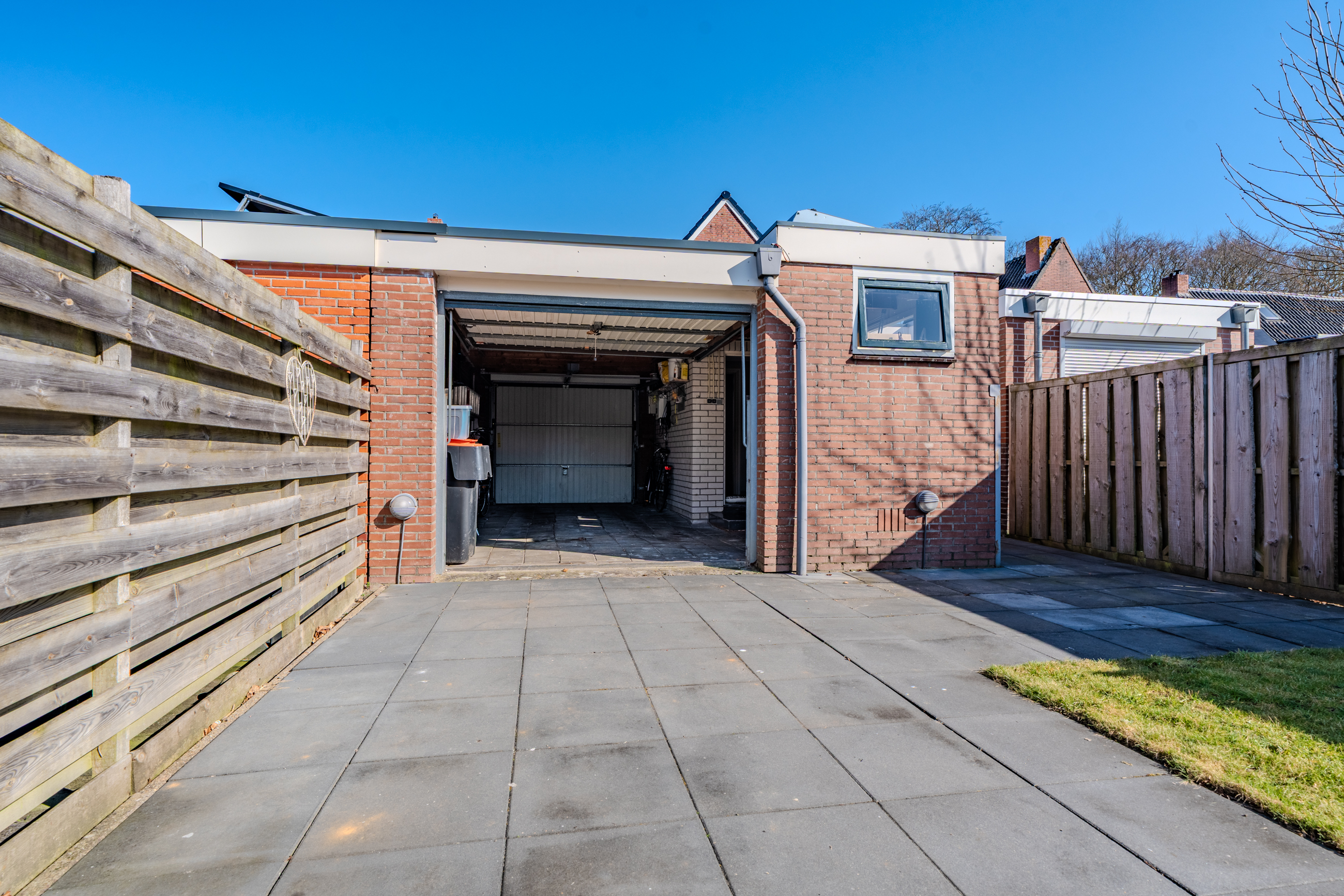 De woning beschikt over een grote aangebouwde stenen garage van c.a. 28 m2 voorzien van elektra en twee garagedeuren waardoor ook de tuin makkelijk bereikbaar is.