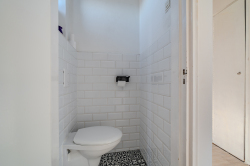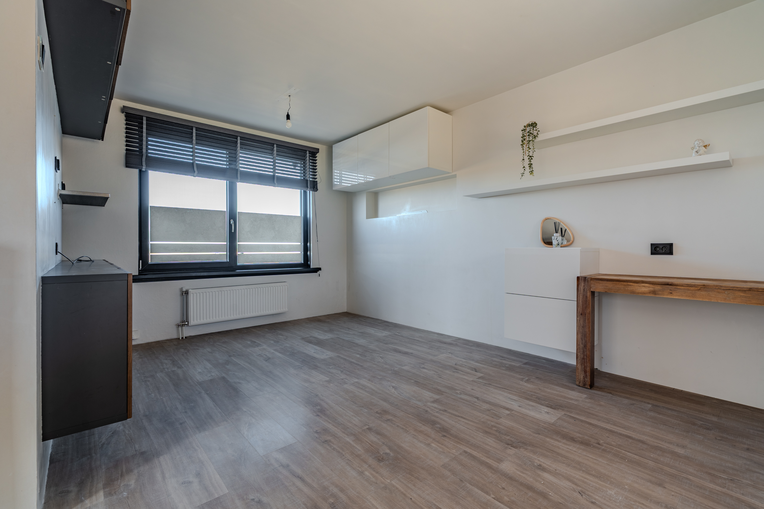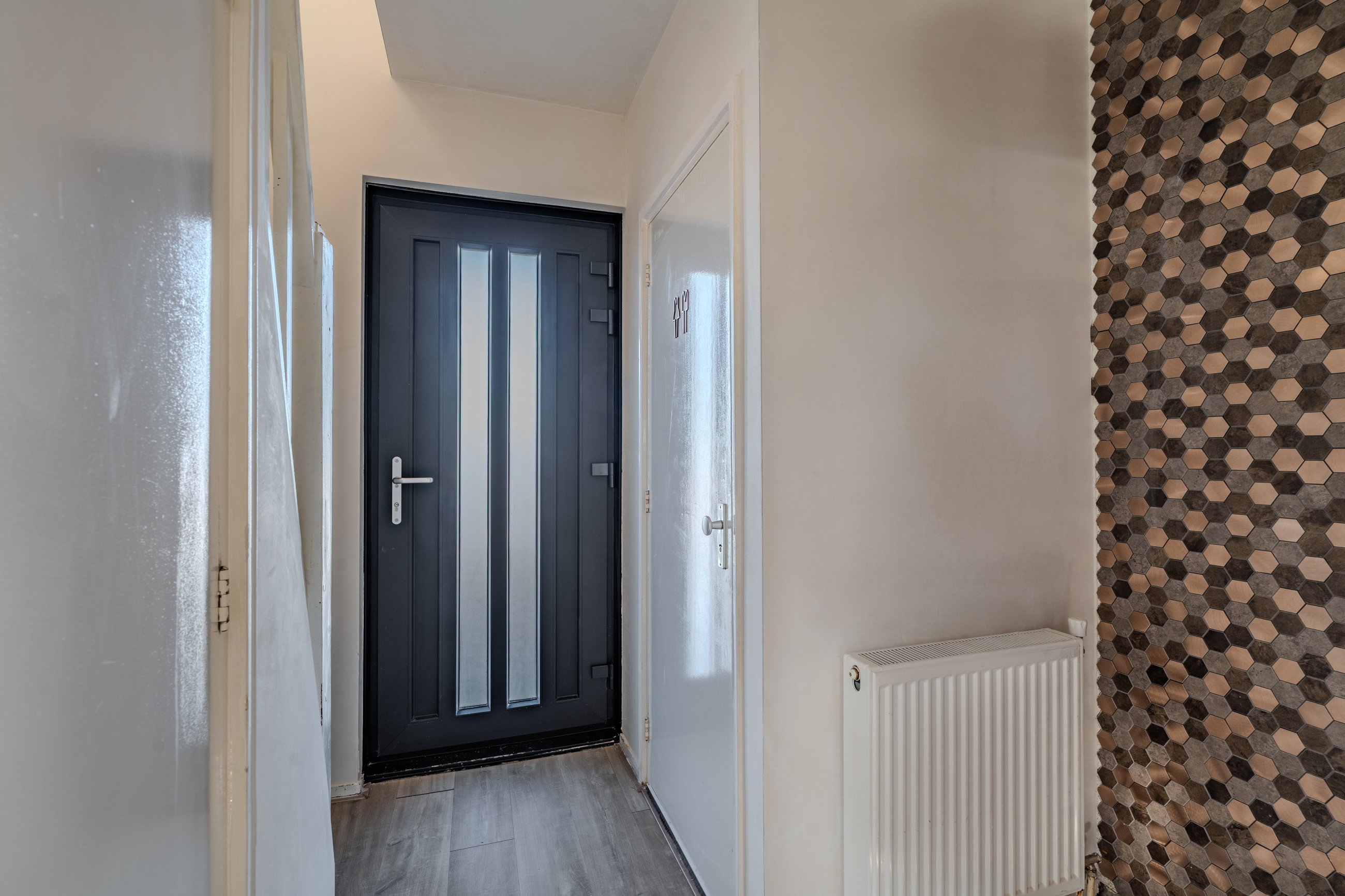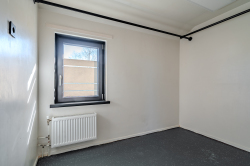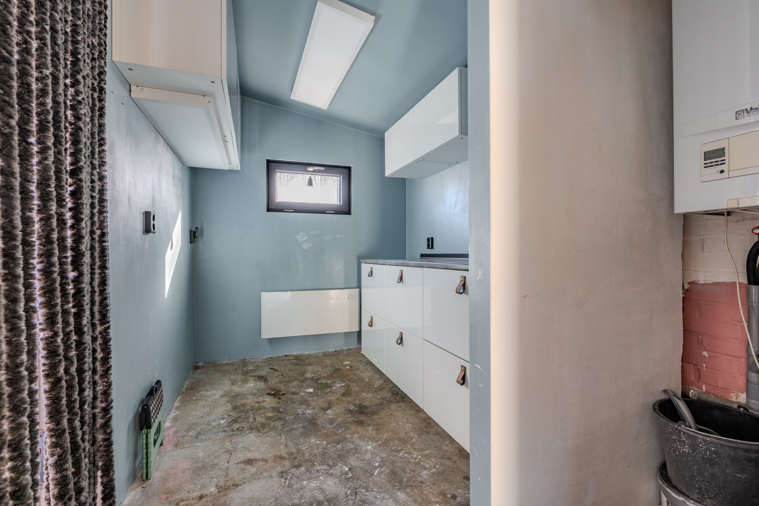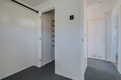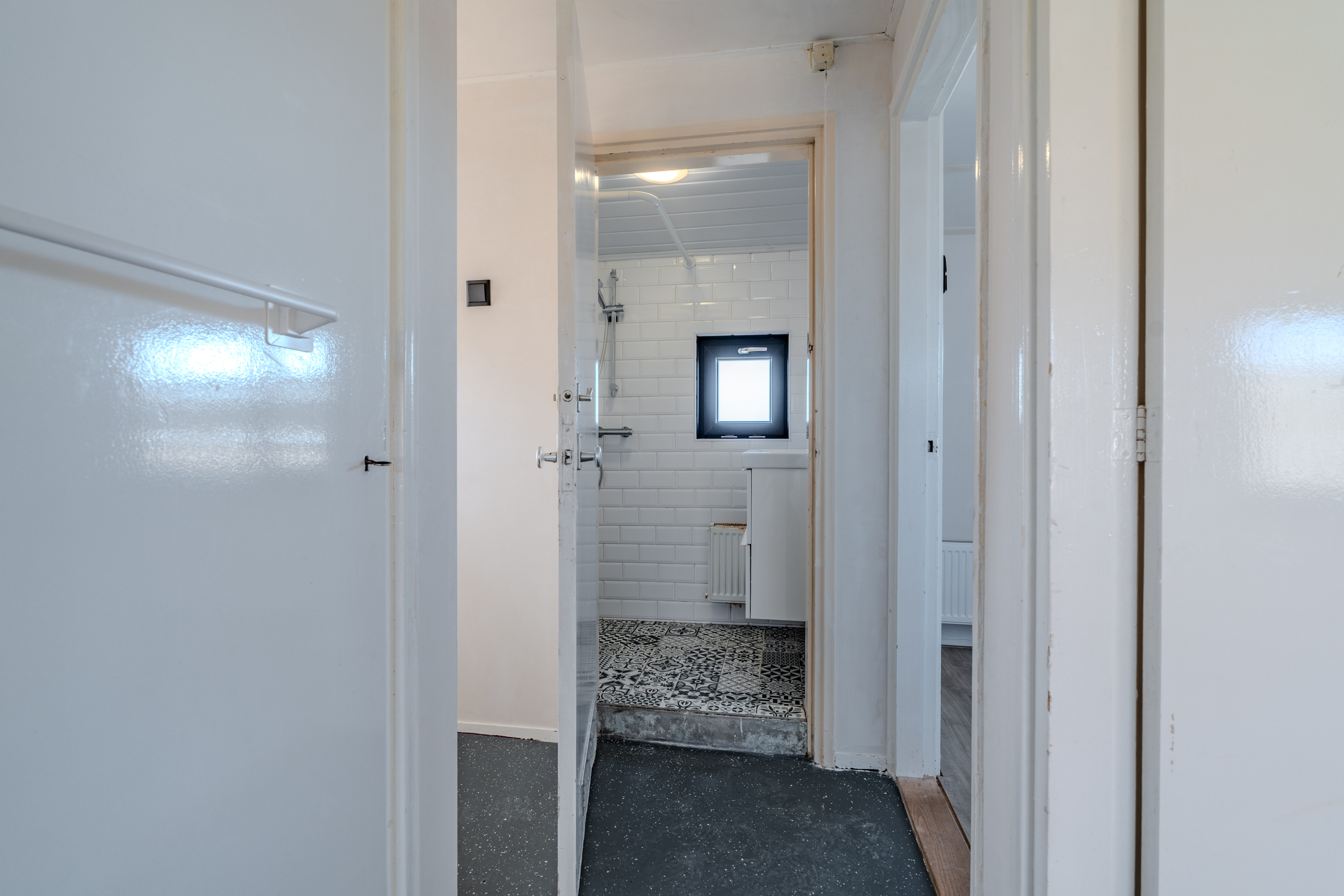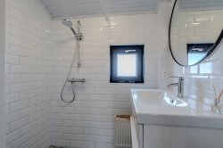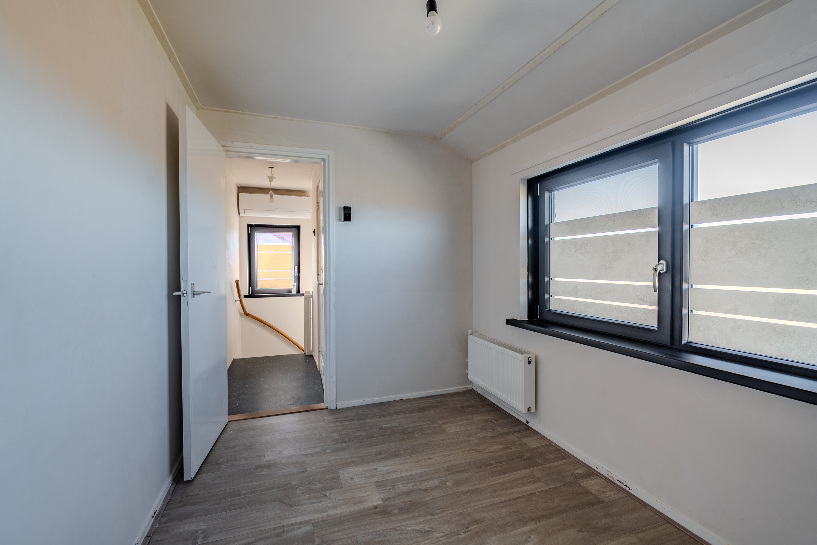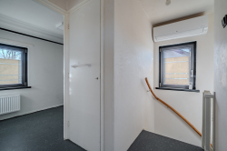 Overloop welke is voorzien van luchtwarmtepomp voor verwarmen en koelen, bergkast, drie slaapkamers en nette badkamer.