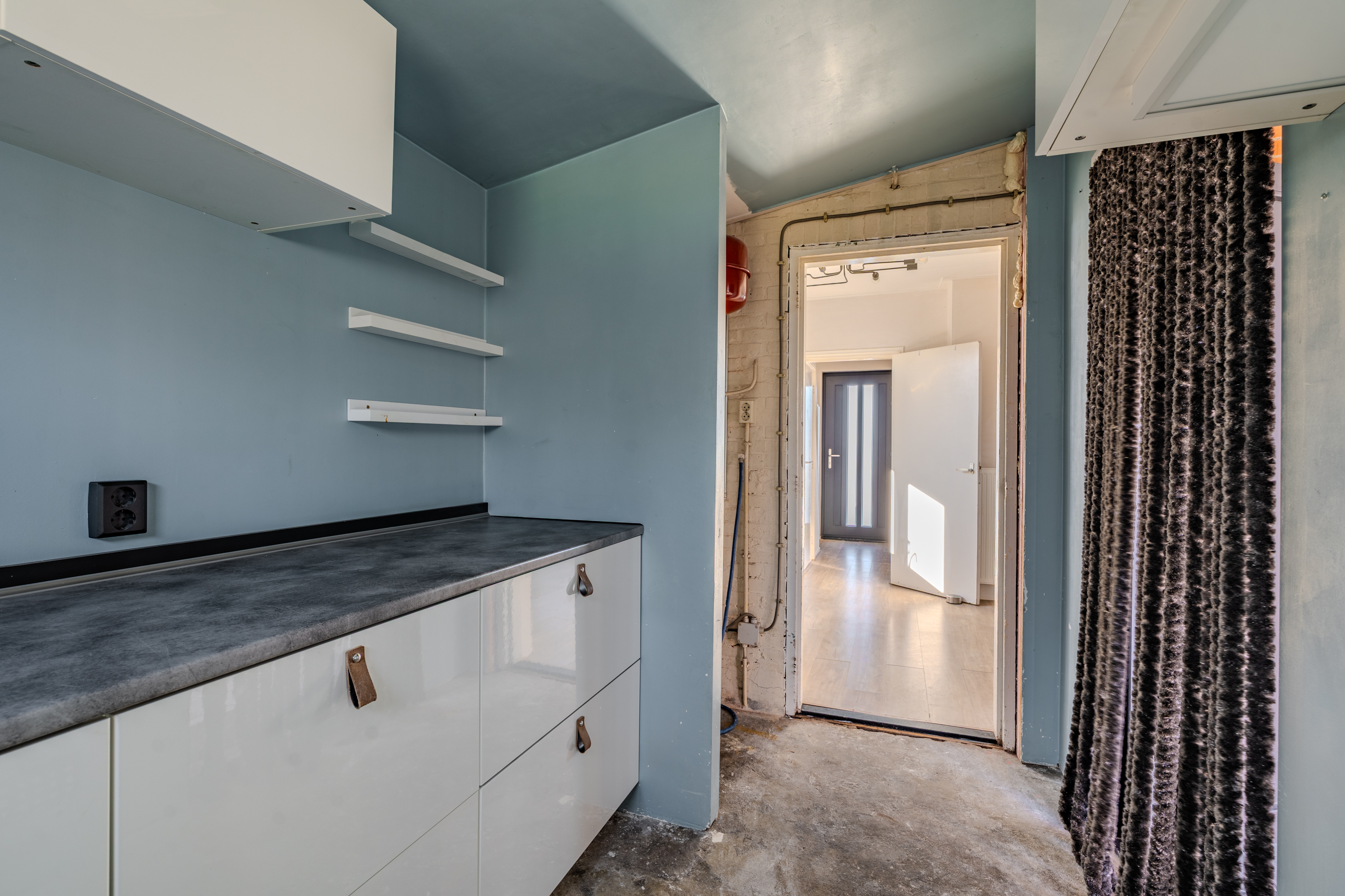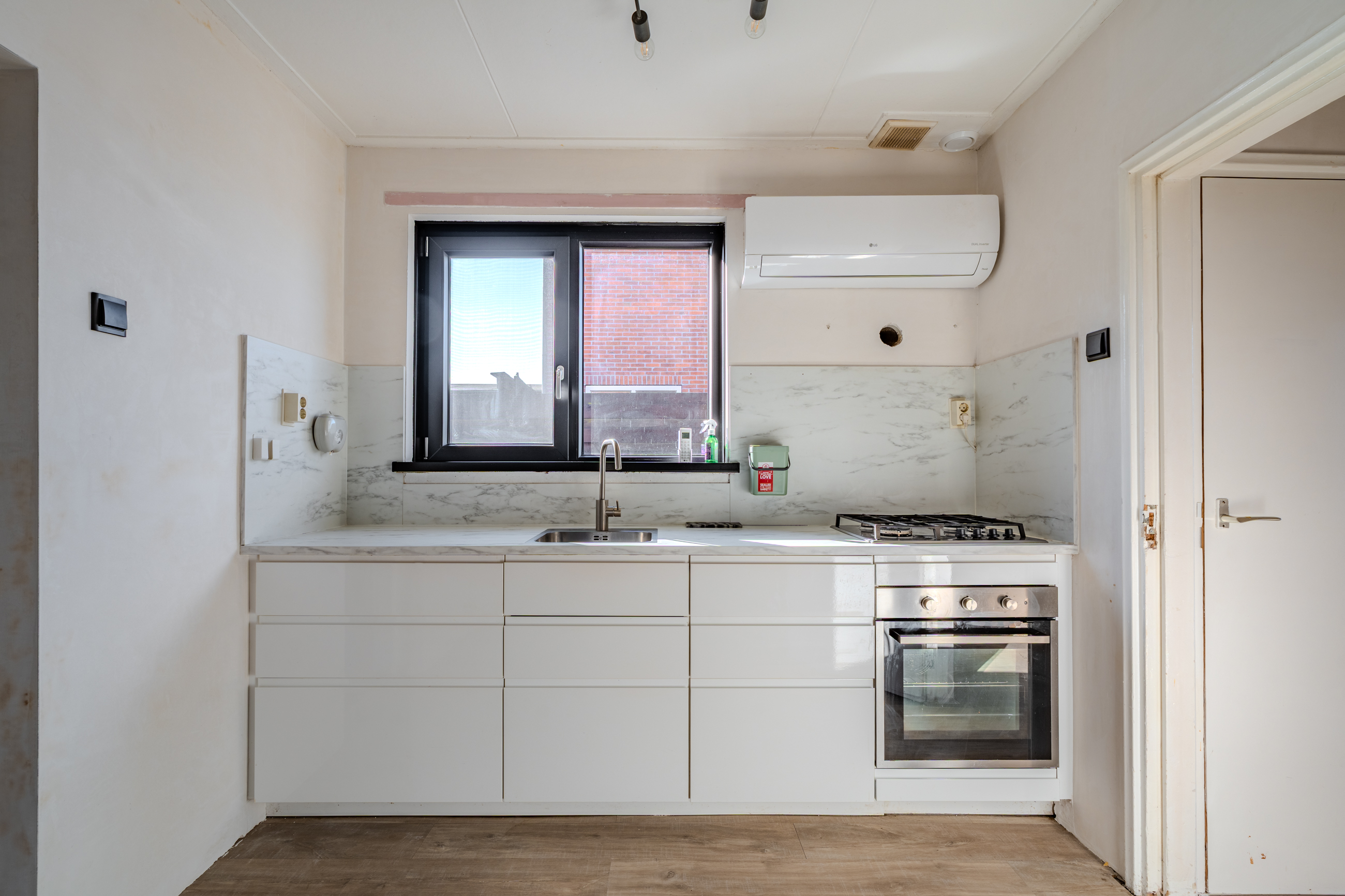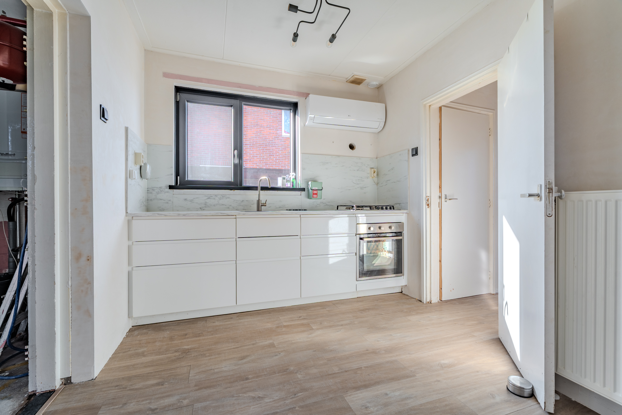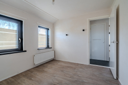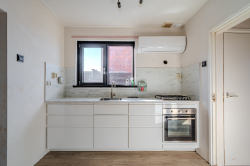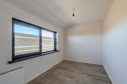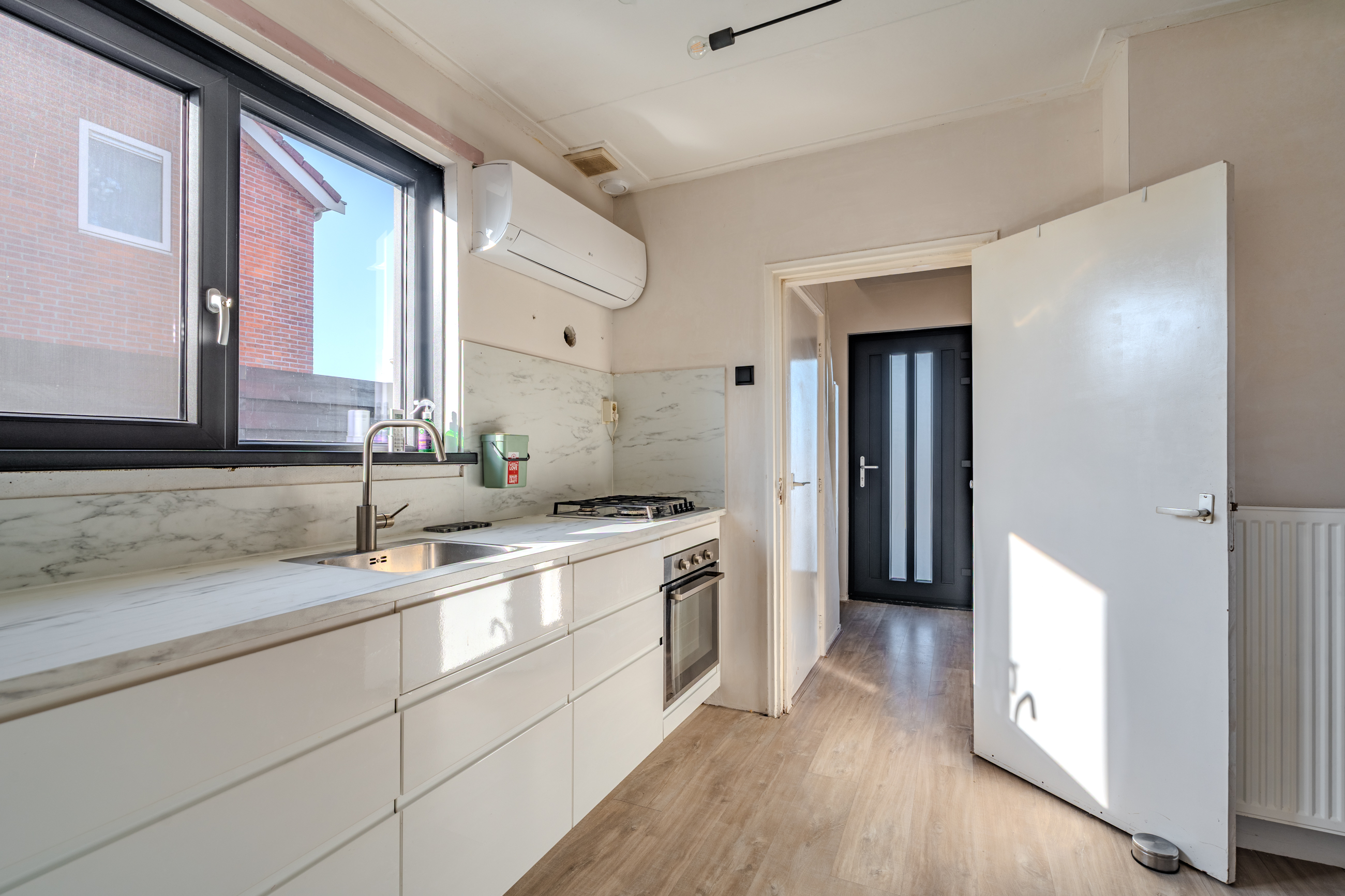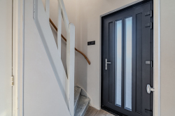 Entree met vaste gesloten trap naar de eerste verdieping, modern toilet, moderne meterkast, kelder trapkast en toegang tot de zonnige woonkamer met open keuken voorzien van luchtwarmtepomp voor verwarmen en koelen en keukenblok voorzien van 4-pits gaskookplaat en oven met aansluitend de bijkeuken met deur naar de veranda.