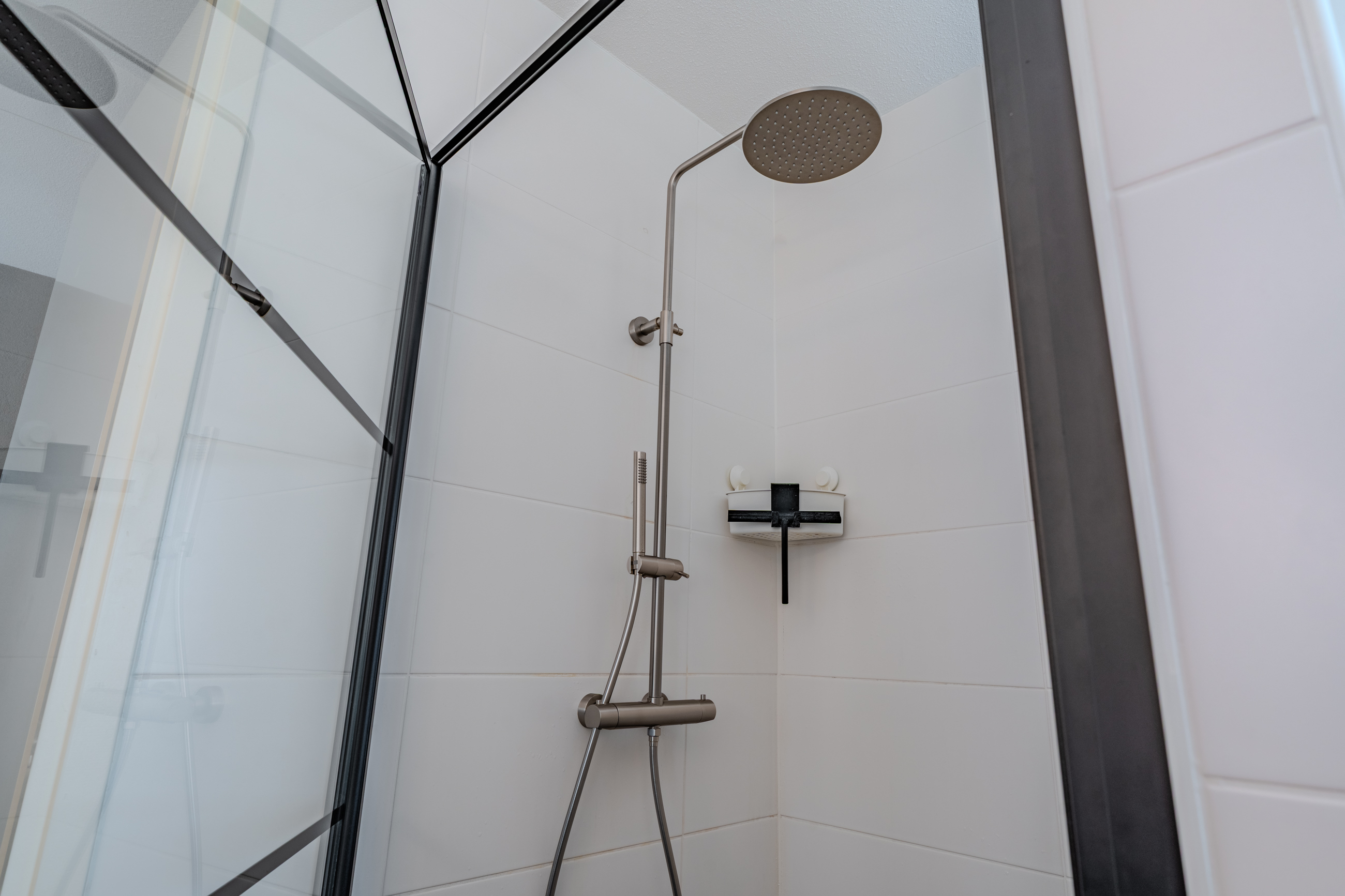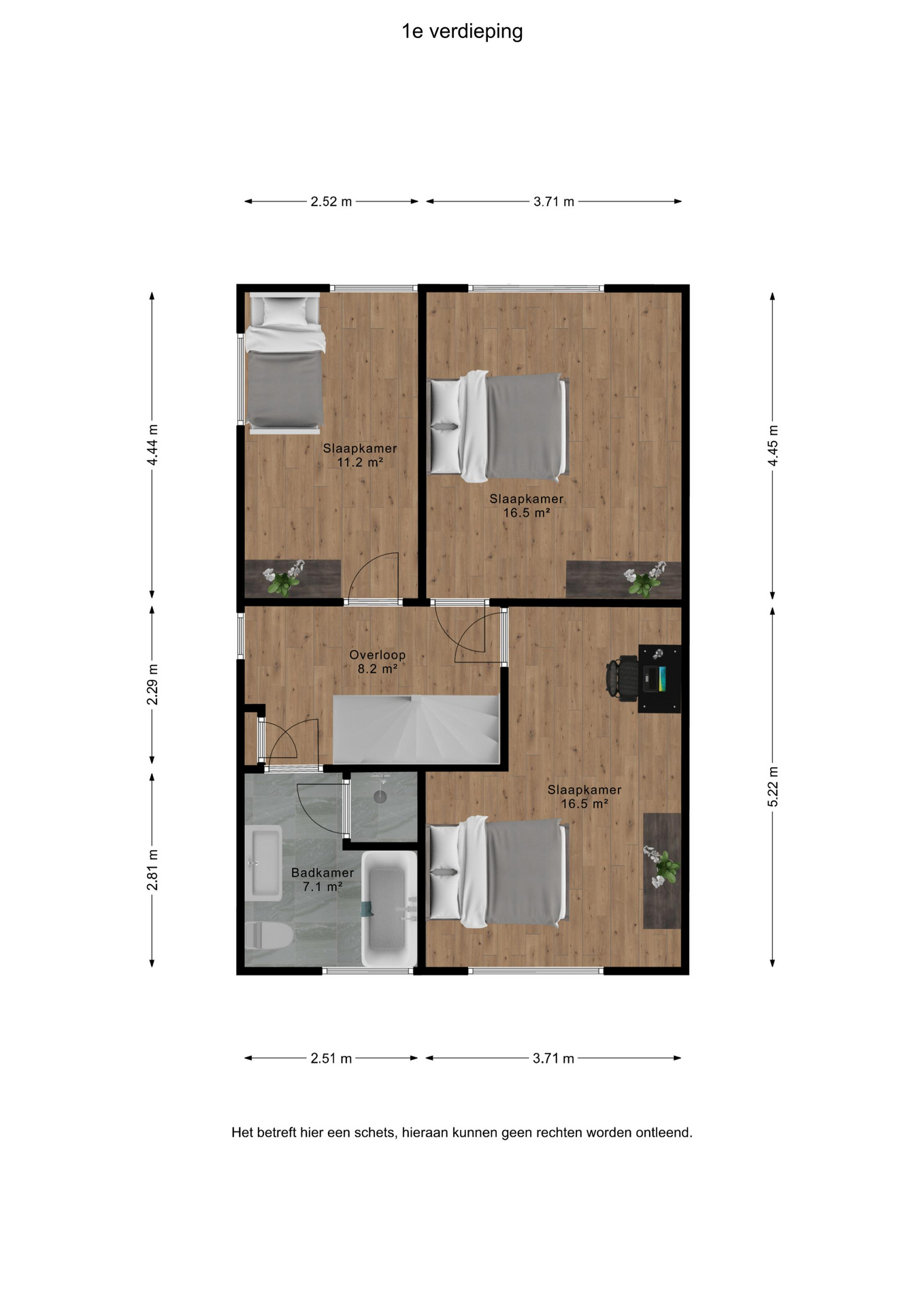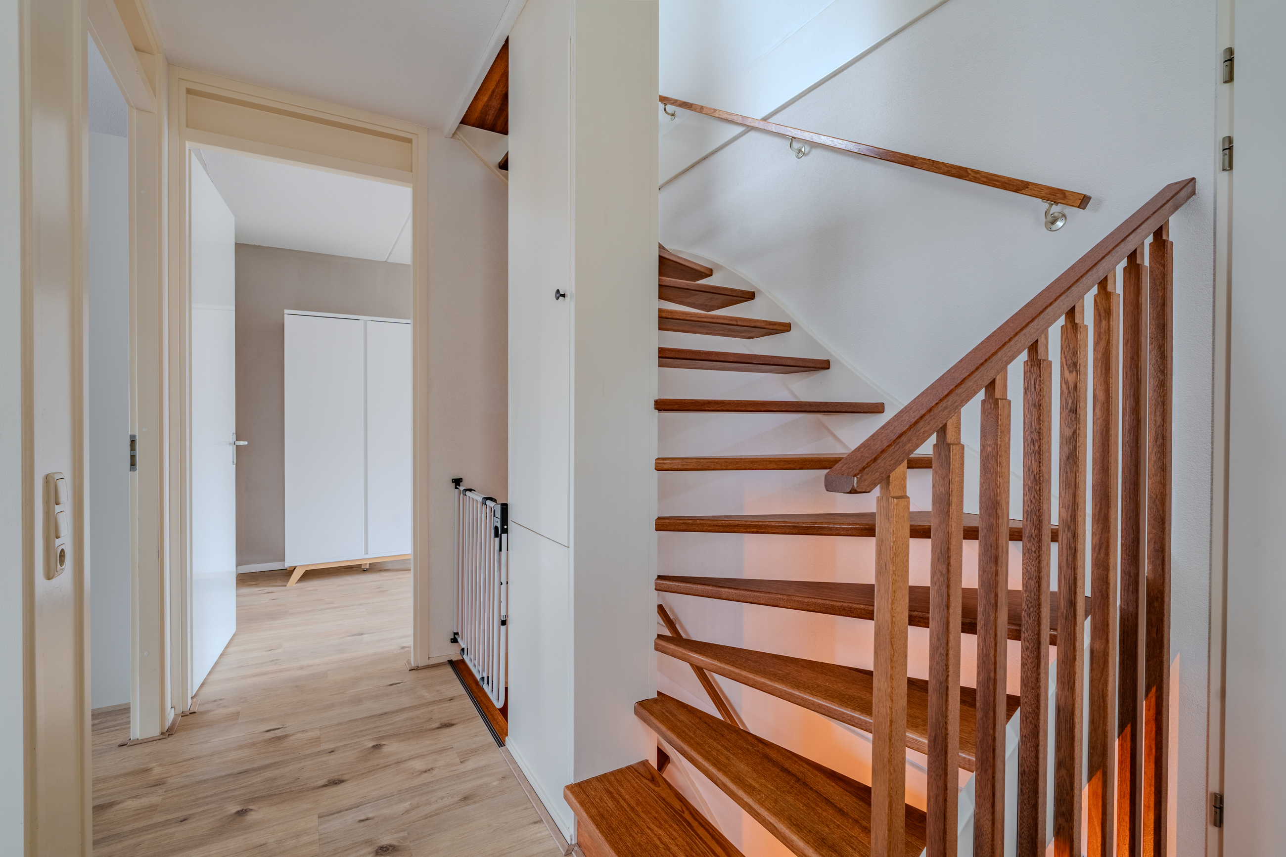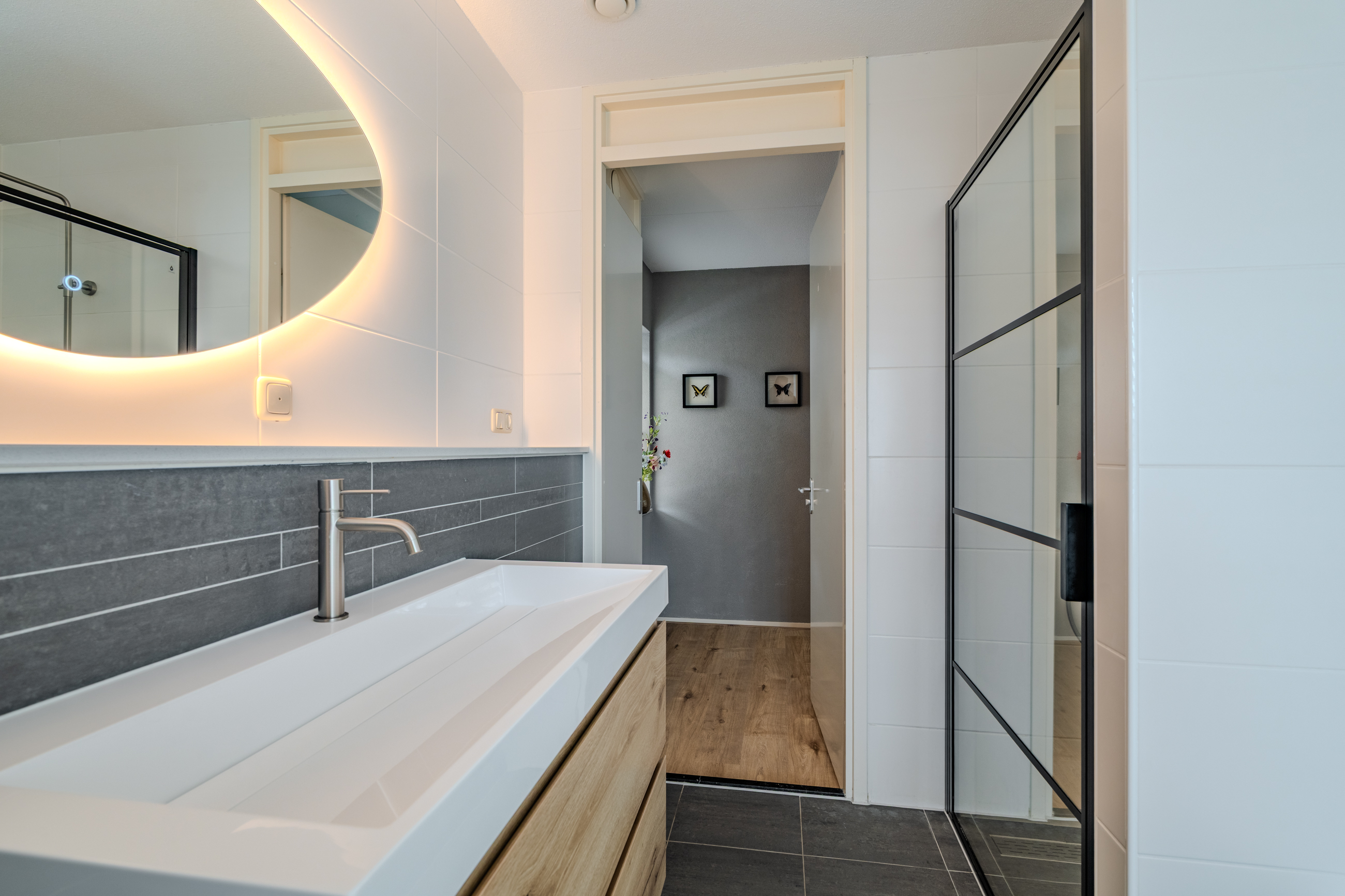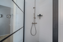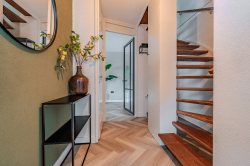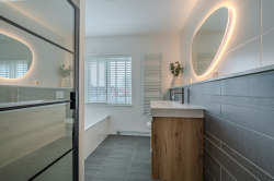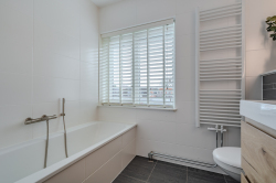 Overloop voorzien van vaste open trap naar de 2e verdieping, bergkast, drie slaapkamers en moderne badkamer voorzien van zwevend toilet, ligbad, inloopdouche, wasmeubel, designradiator en centrale afzuiging.