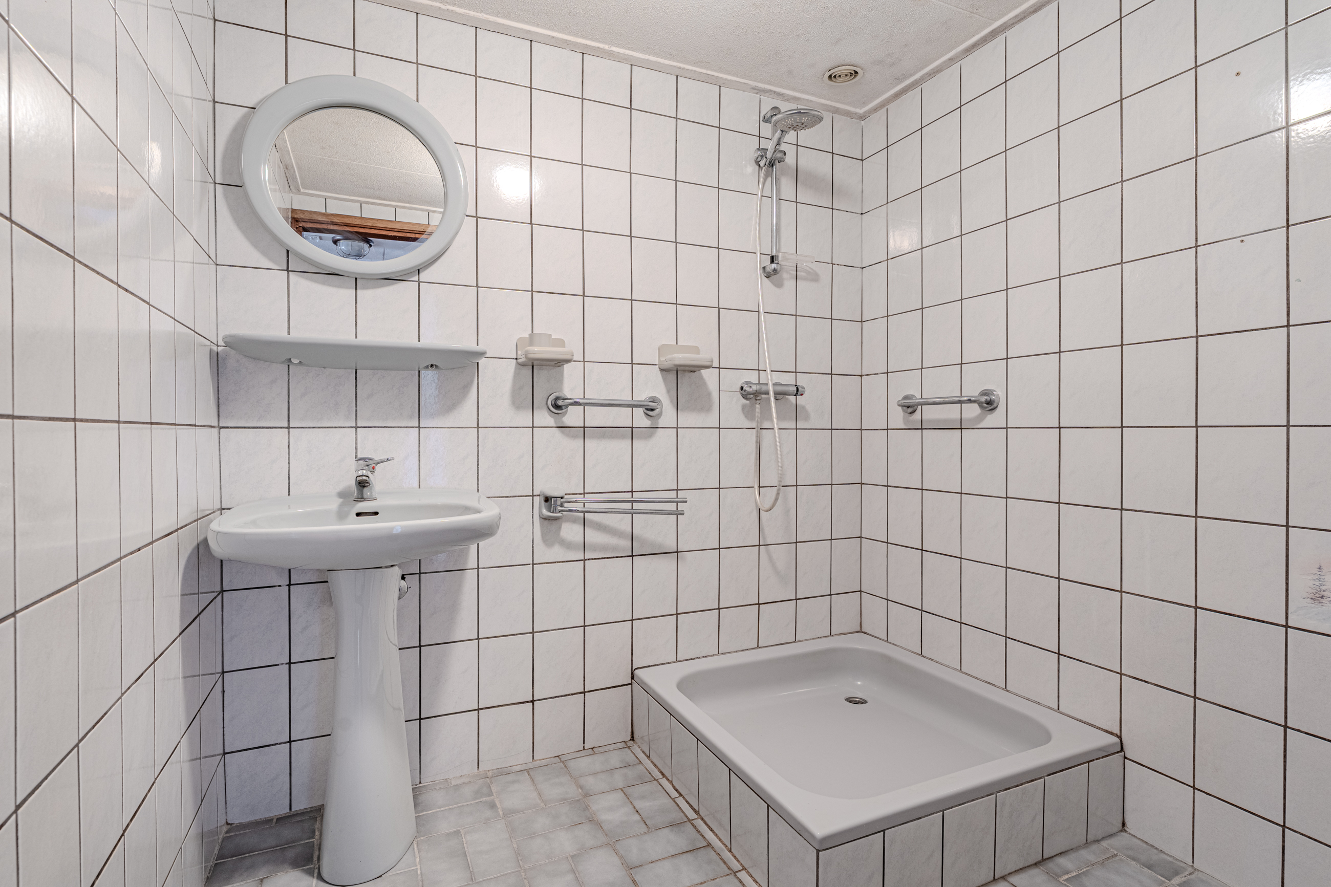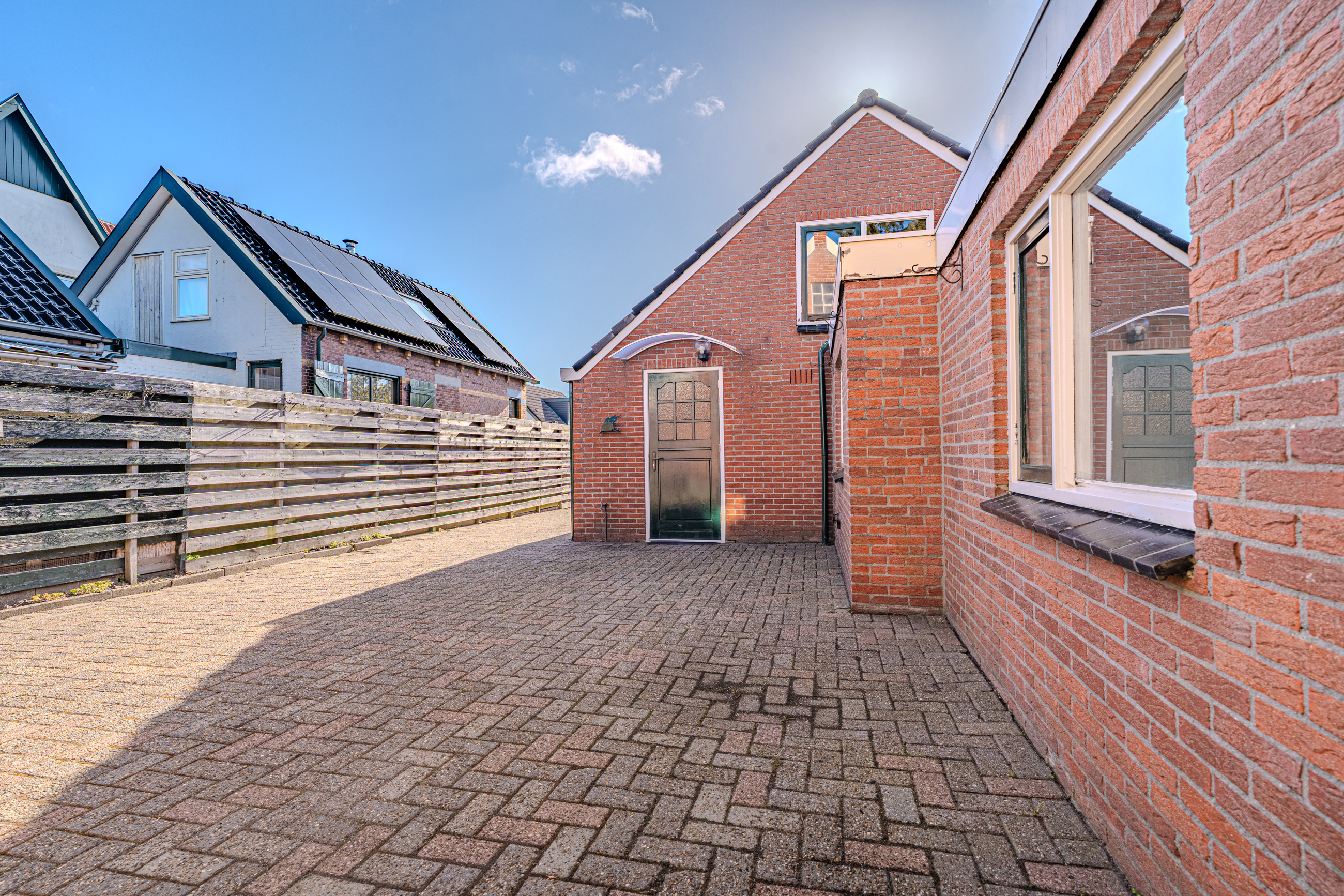 Entree aan de voorzijde in de hal met toegang naar de ruime gesloten woonkeuken voorzien van keukenblok met inbouwapparatuur en vaste trap naar de 1e verdieping, woonkamer met aansluitend de zijkamer. Bijkeuken voorzien van witgoedaansluiting en toegang naar het terras, toilet, badkamer voorzien van douche en wastafel, bergkast met geiser en slaapkamer.