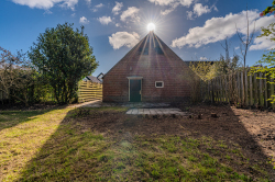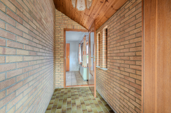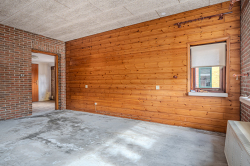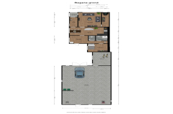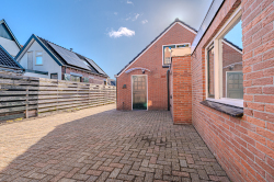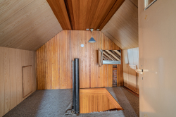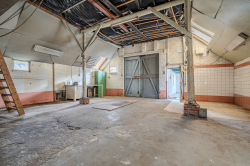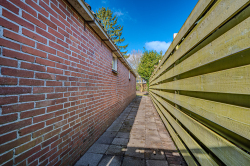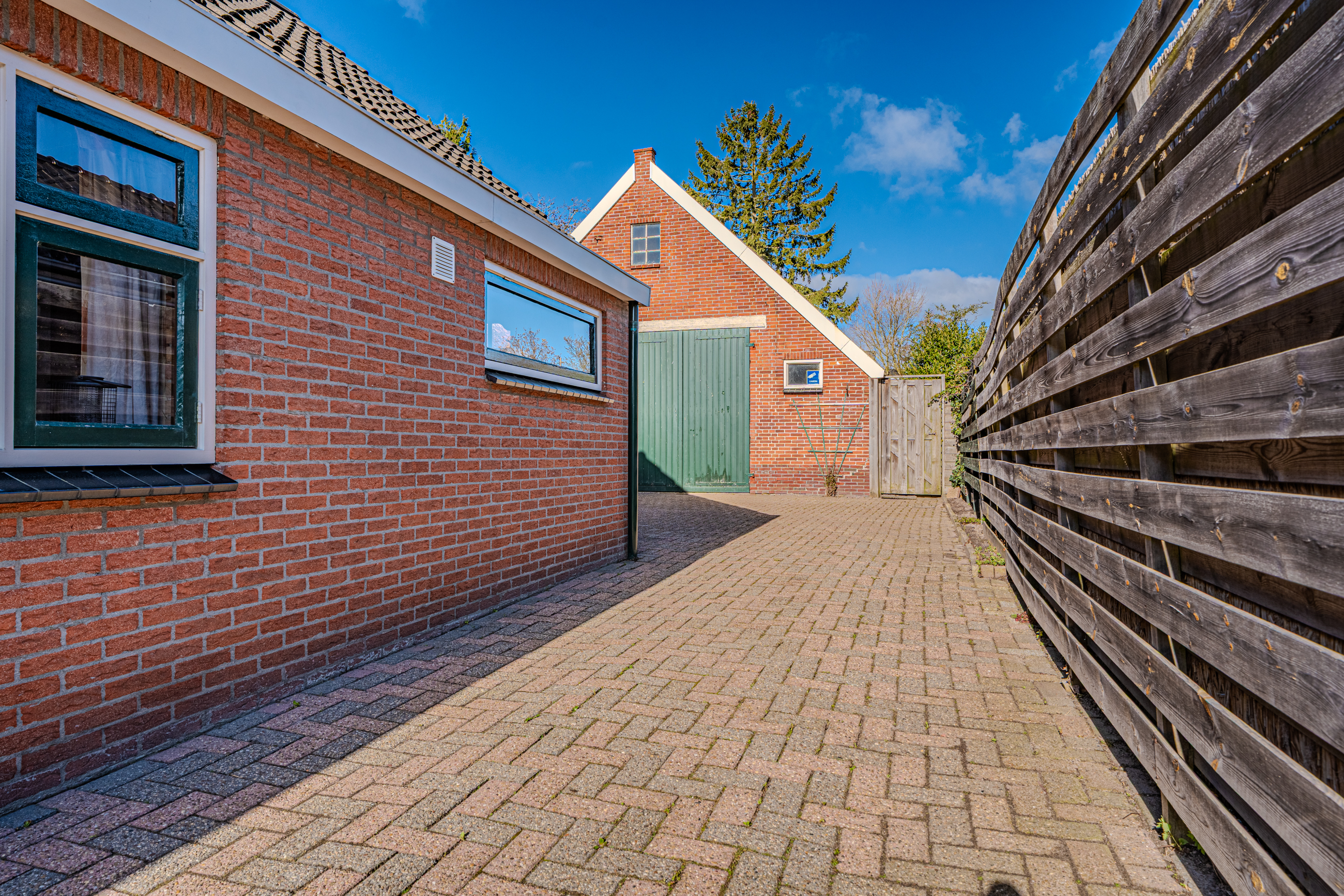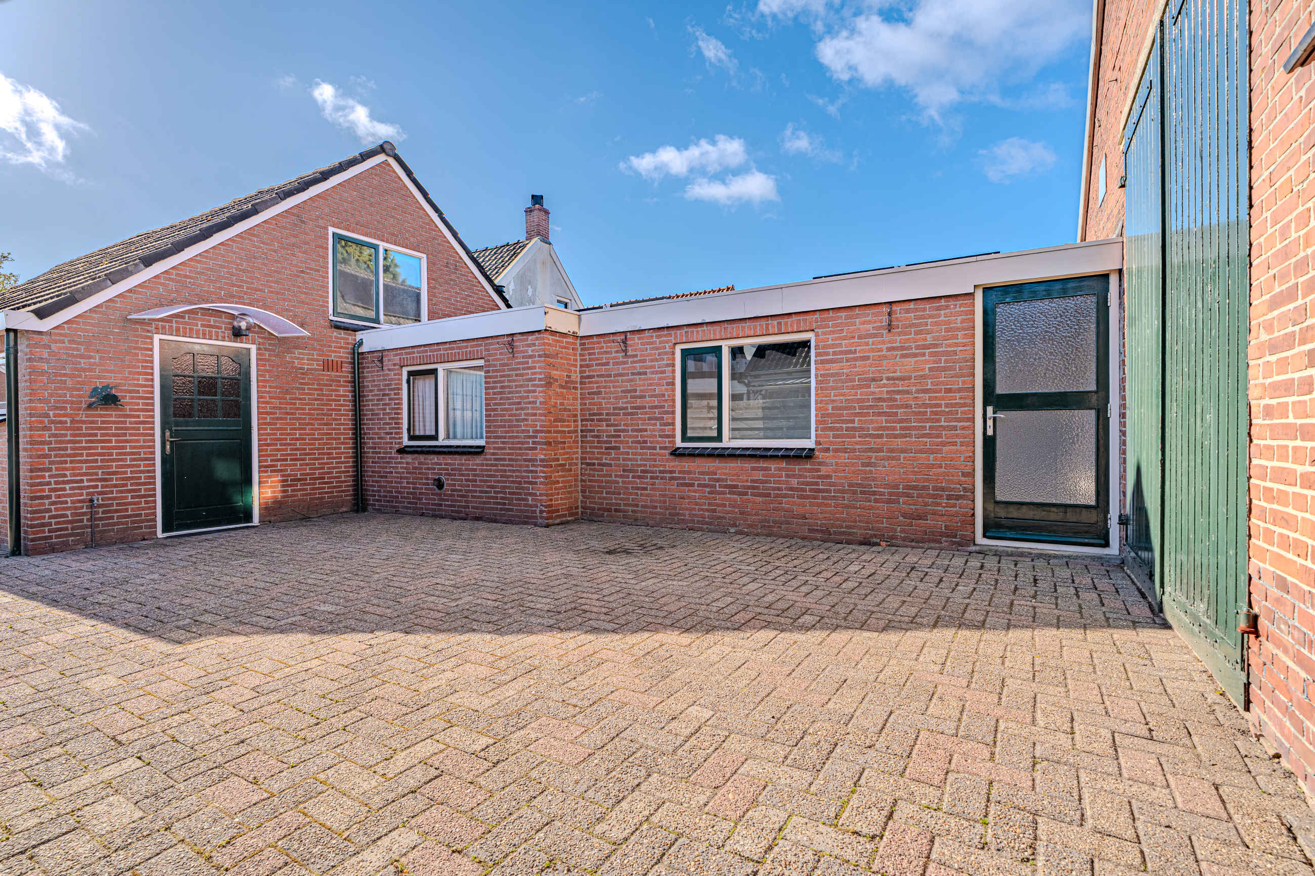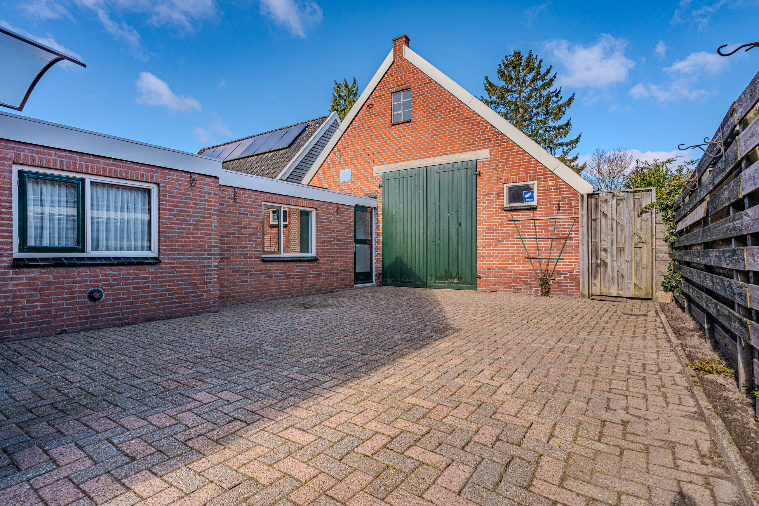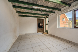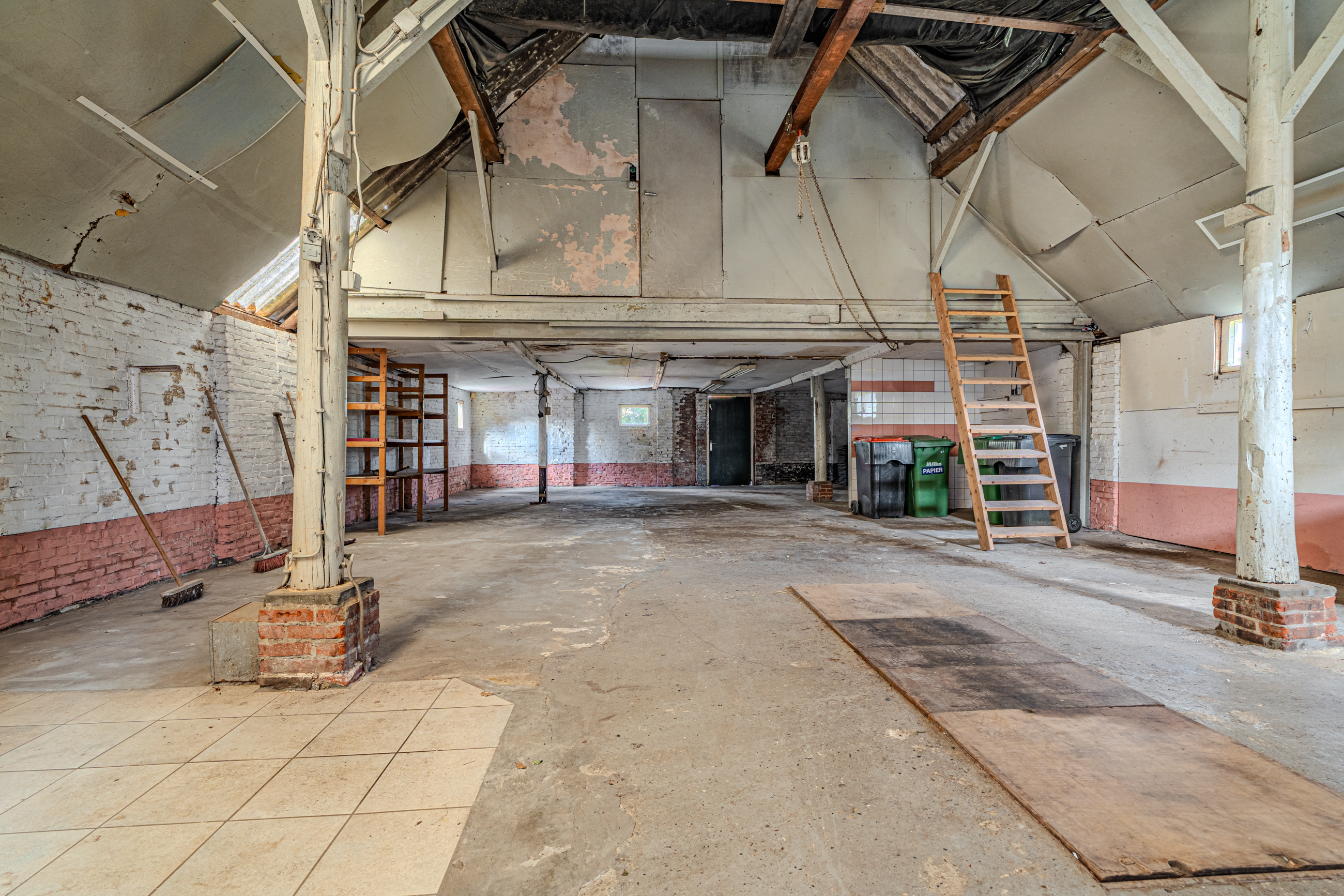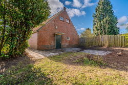 Via het terras komen we in een multifunctionele ruimte welke toegang geeft tot de grote schuur welke is voorzien van elektra, een grote deur aan de voorzijde en een loopdeur aan de achterzijde naar de tuin.