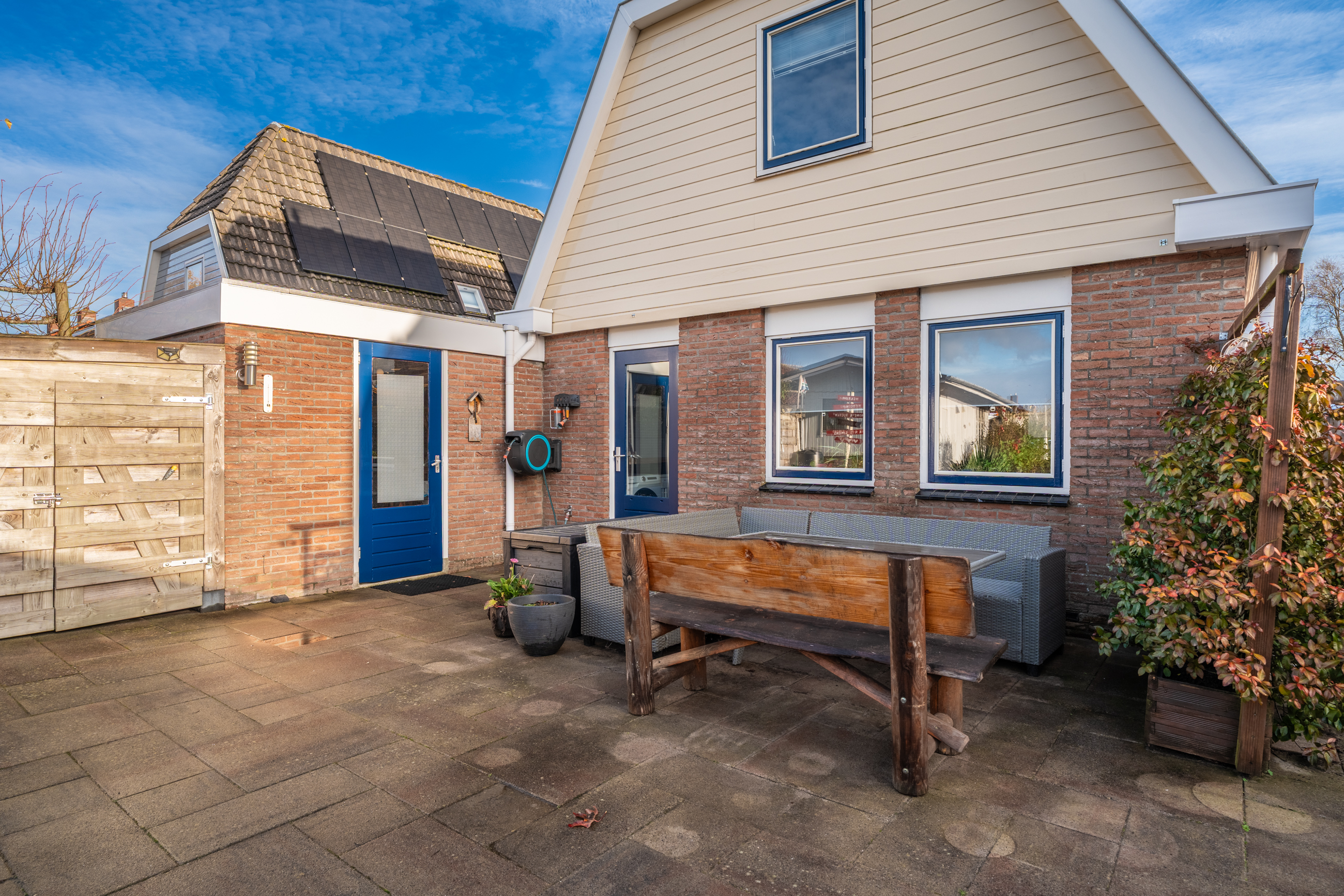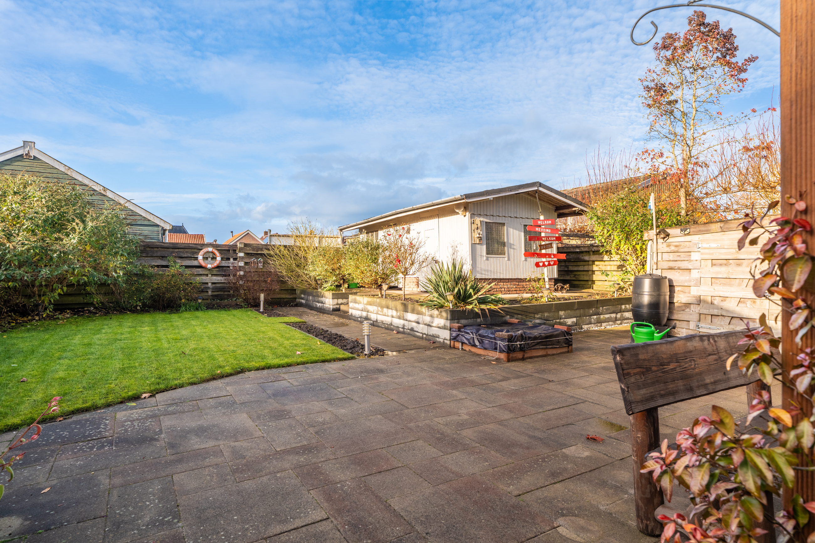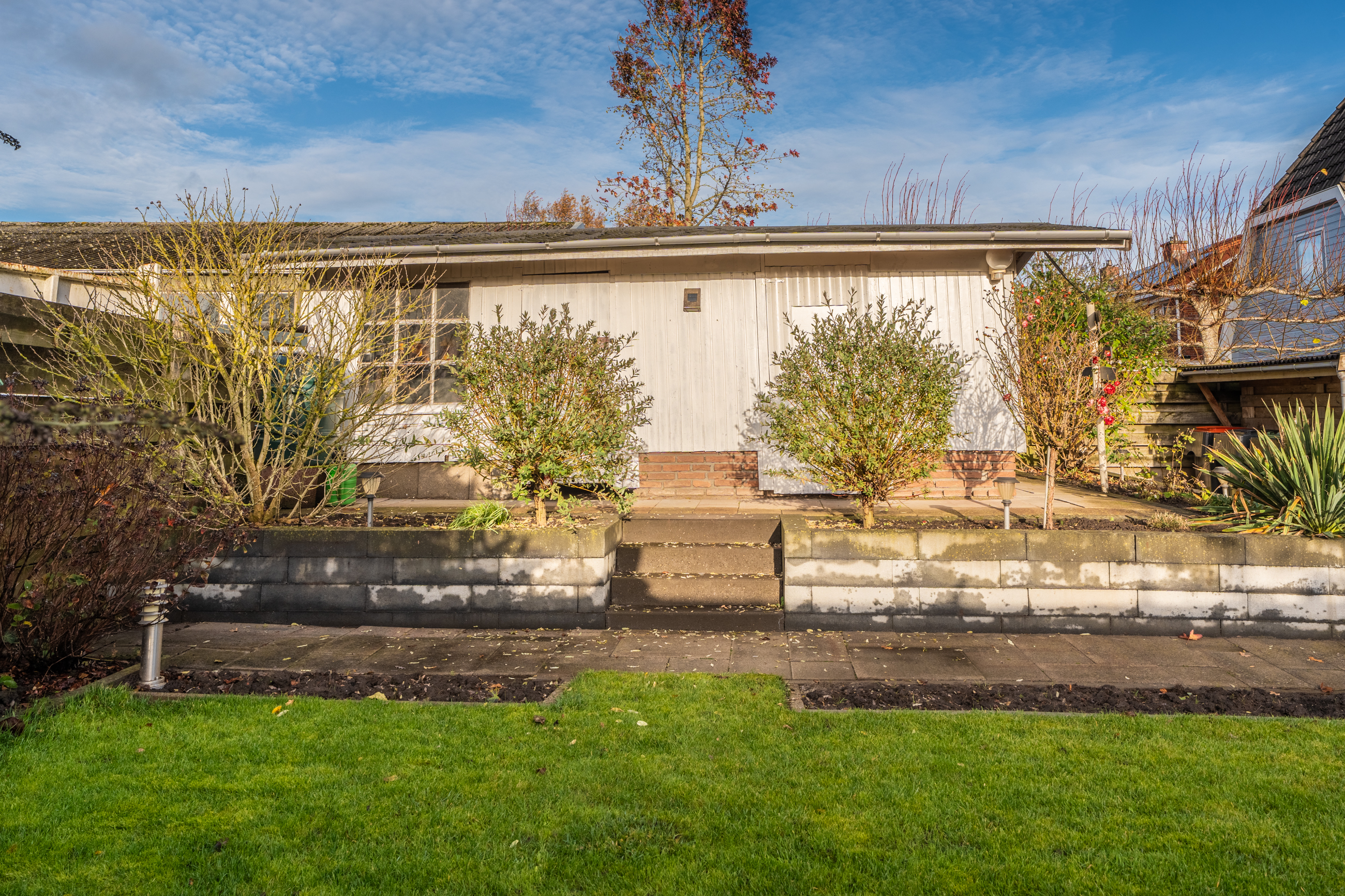 In de royale tuin bevinden zich het zonneterras, de aangebouwde stenen garage met aangebouwd houten schuurtje en de vrijstaande houten schuur achter in de tuin.