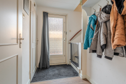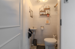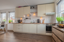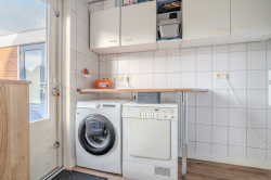 Entree aan de rechterzijde met trapopgang naar de eerste verdieping, toilet, moderne meterkast en toegang tot de sfeervolle woonkamer met open keuken uitgerust met elektrische kookplaat, oven, afzuigkap en vaatwasser, royale bijkeuken voorzien van witgoedaansluitingen en deur naar de tuin.