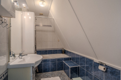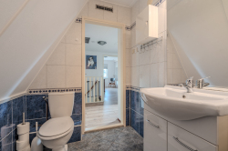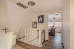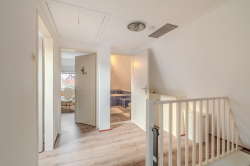 Via de vaste trap in het hal komen we op de overloop van de eerste verdieping, hier bevinden zich de drie slaapkamers en de badkamer voorzien van ligbad, wasmeubel en toilet.