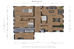 Entree aan de voorzijde met ontvangst in de centrale hal met trapopgang naar de eerste verdieping, de provisiekelder, de woonkamer met aansluitend de gesloten keuken, de twee badkamers, de twee slaapkamers, het toilet en de ruime bijkeuken.