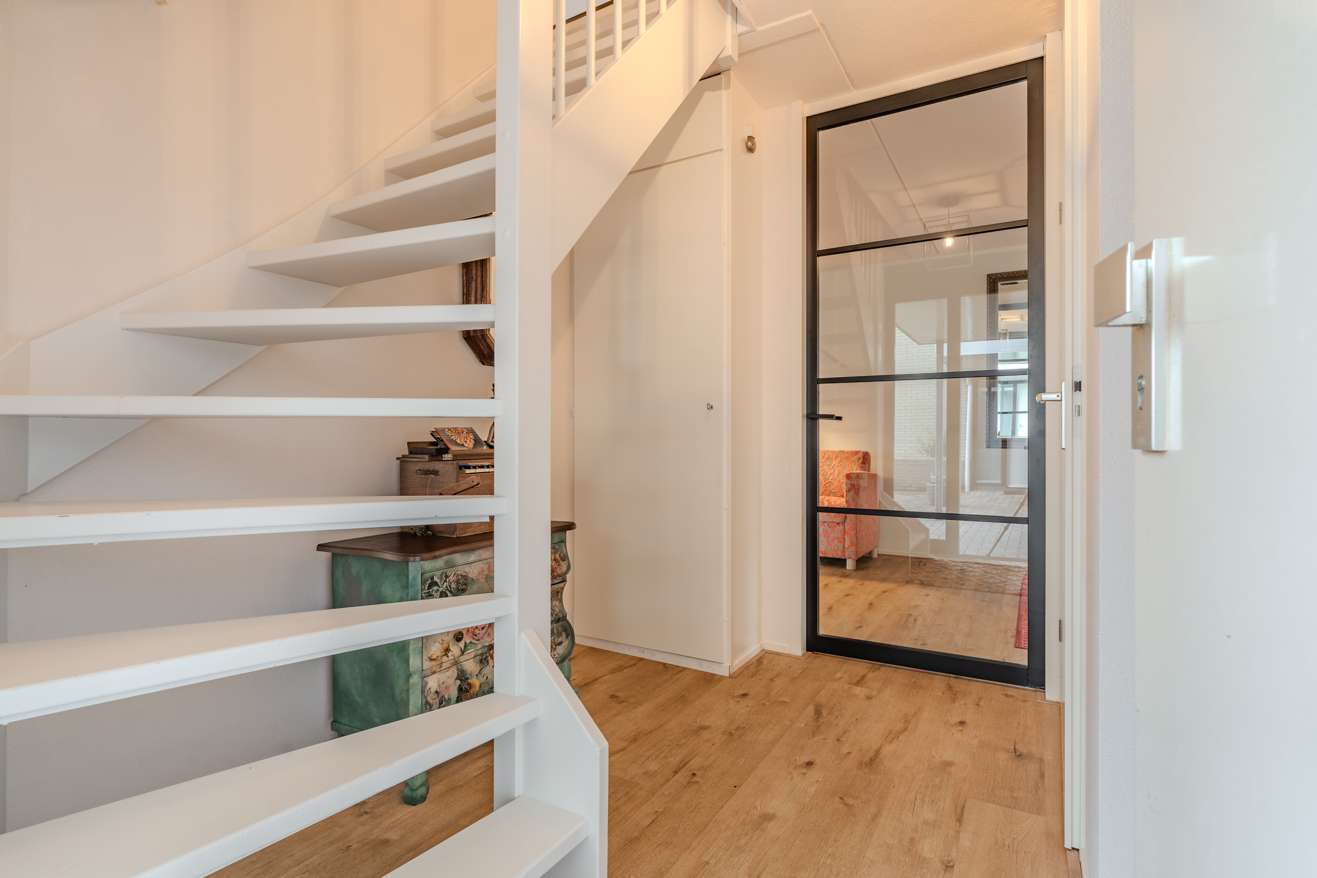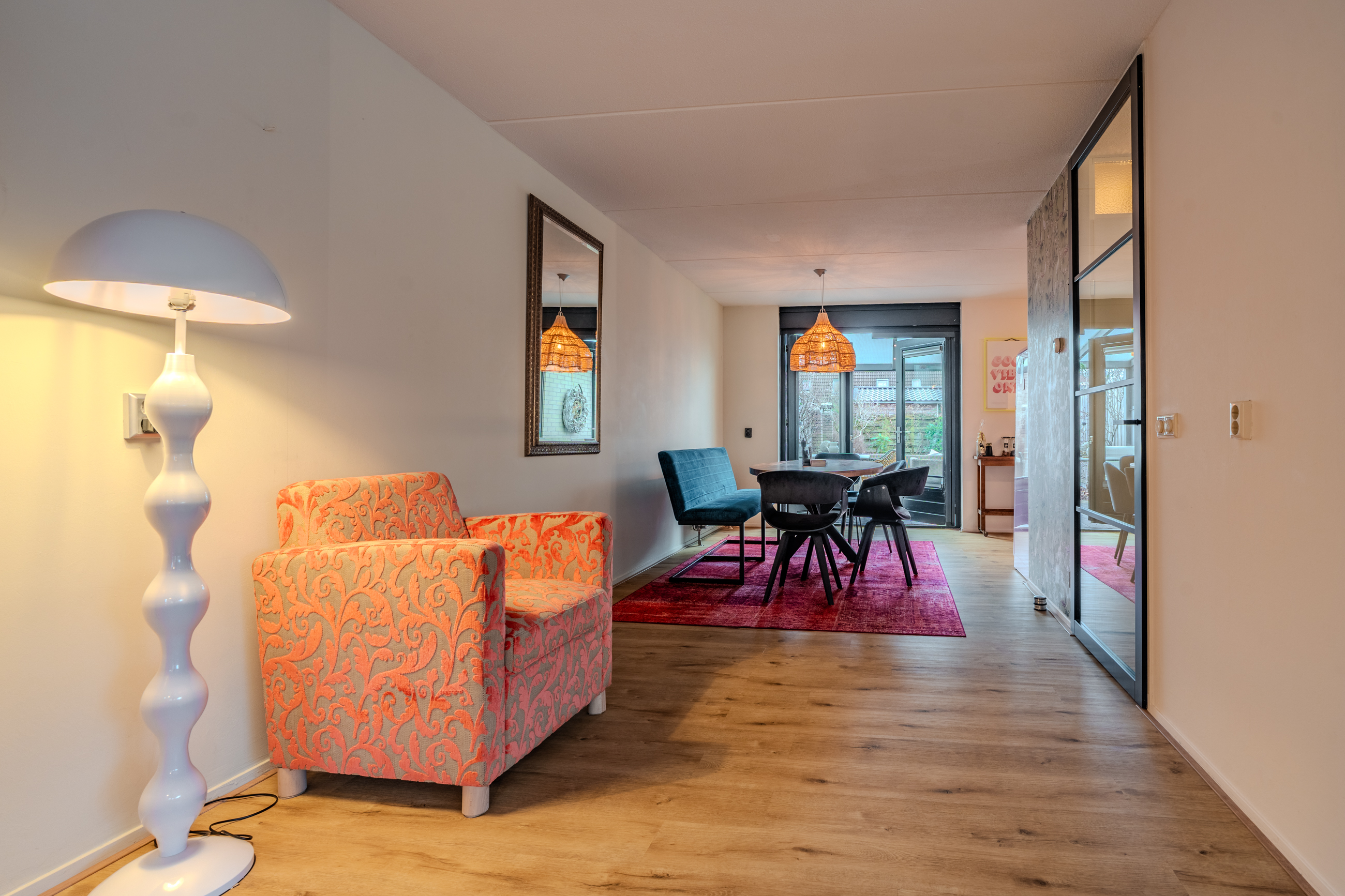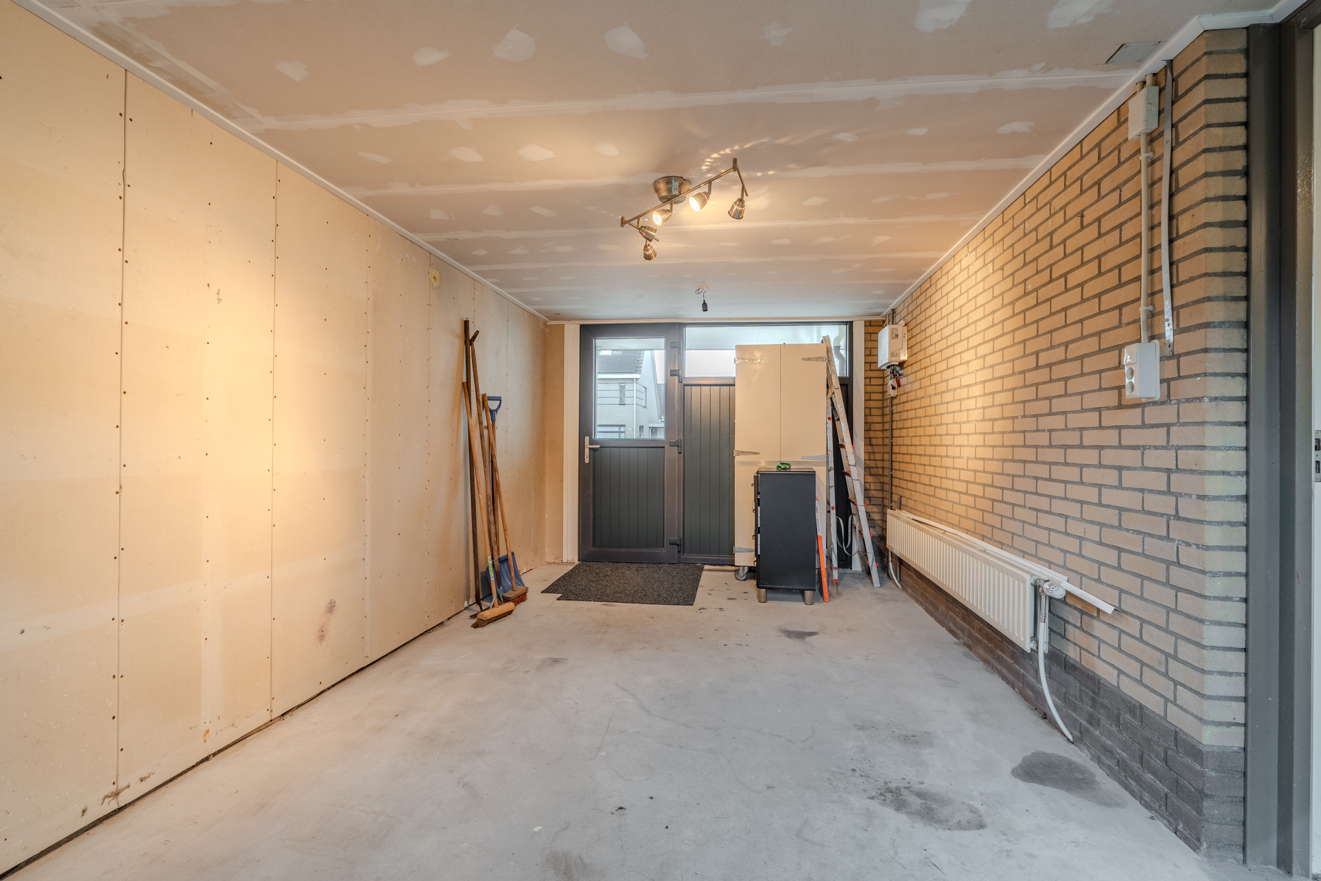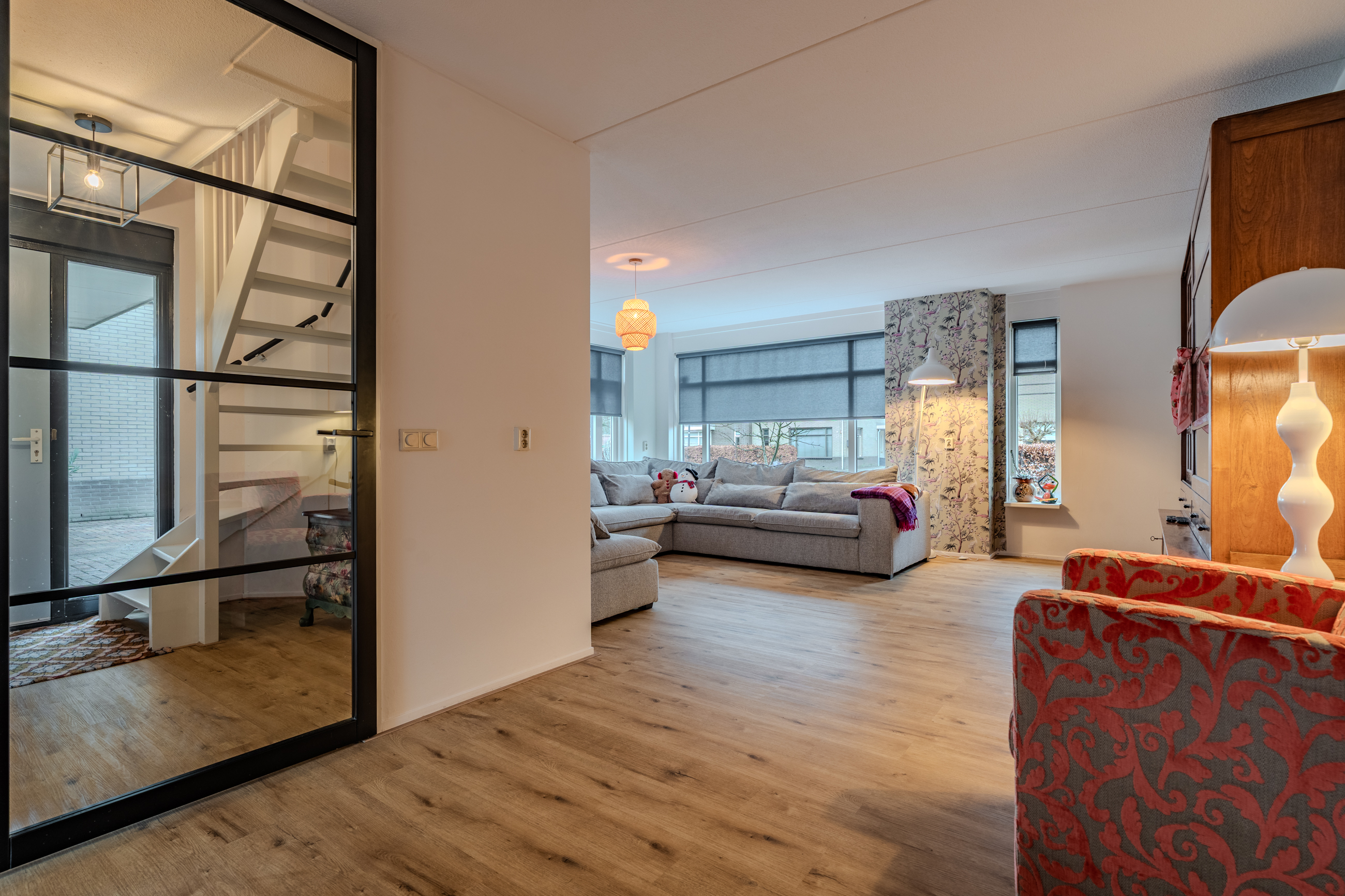 Entree met garderobe nis, vaste open trap naar de eerste verdieping, moderne wc, voorzien van zwevend toilet, fontein en centrale afzuiging, moderne meterkast en toegang tot de royale zonnige woonkamer met openslaande tuindeuren naar het terras, luxe open keuken voorzien van inbouw apparatuur zoals 4-pits inductie kookplaat, oven, afzuigkap, Quooker en vaatwasser, aansluitend de ruime bijkeuken voorzien van witgoedaansluiting, gootsteen en deur naar het terras en toegang naar de voormalige garage omgebouwd naar multifunctionele ruimte voorzien van verwarming, electra, deur naar de tuin en kunststof entree aan de voorzijde.