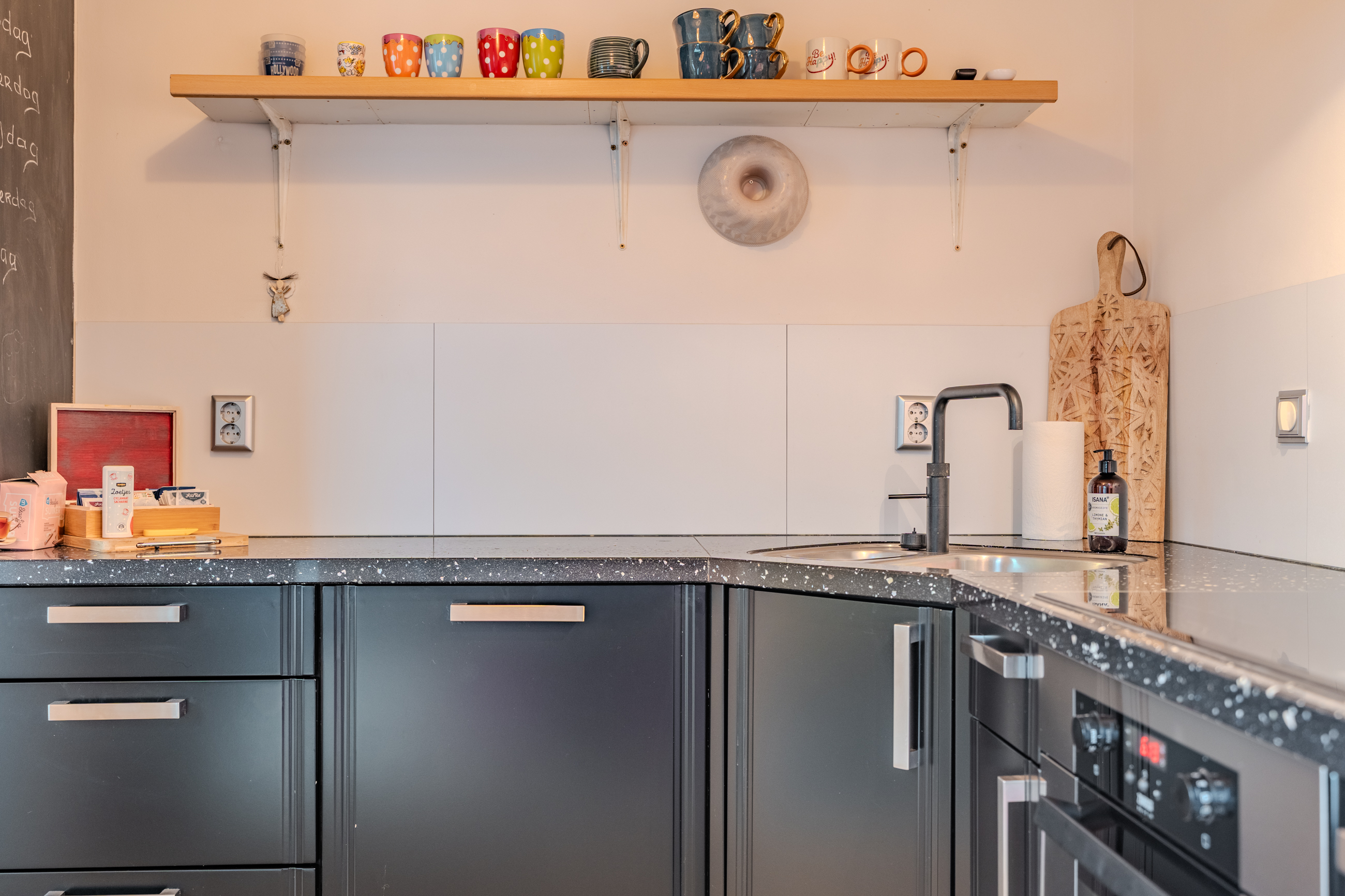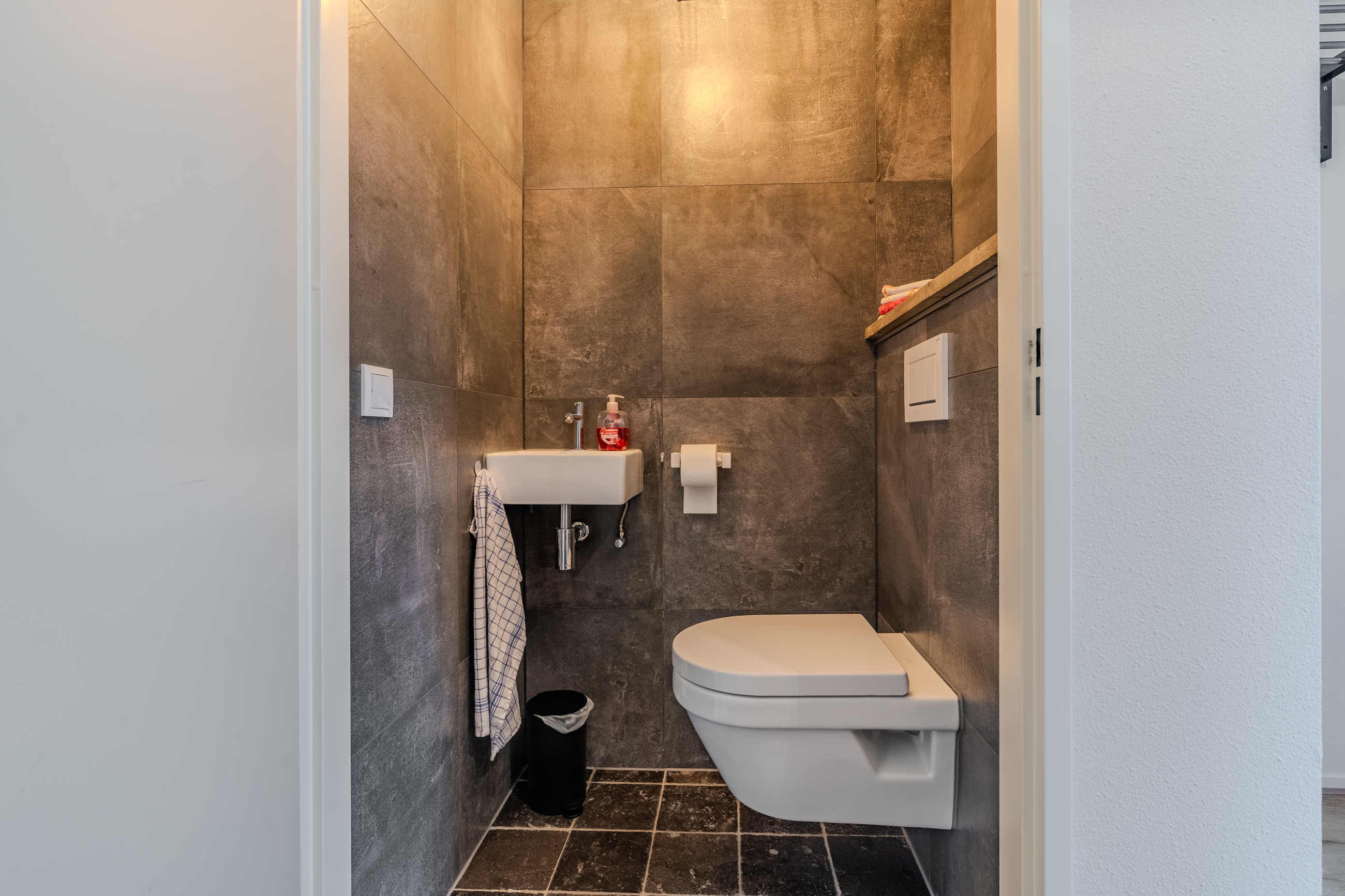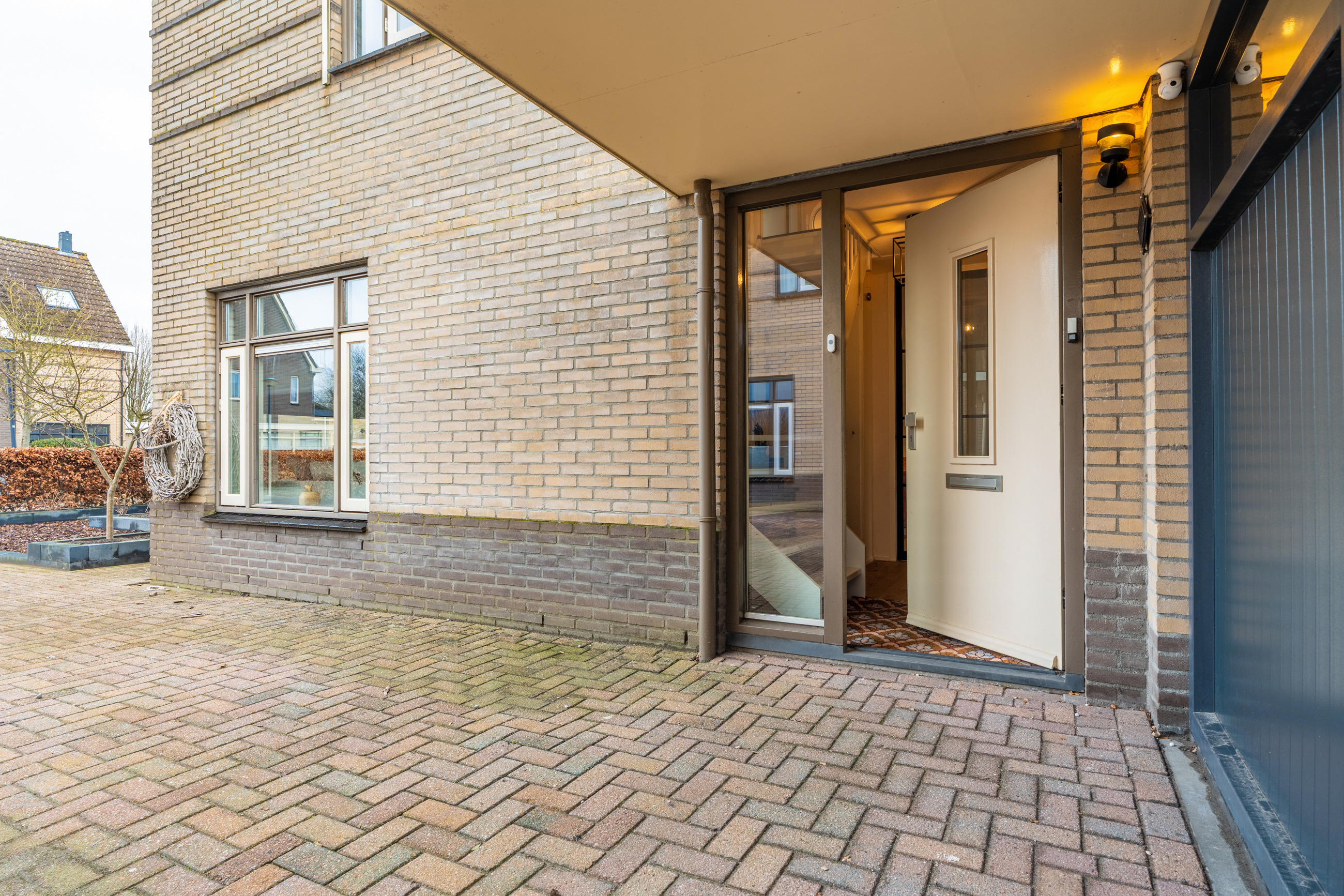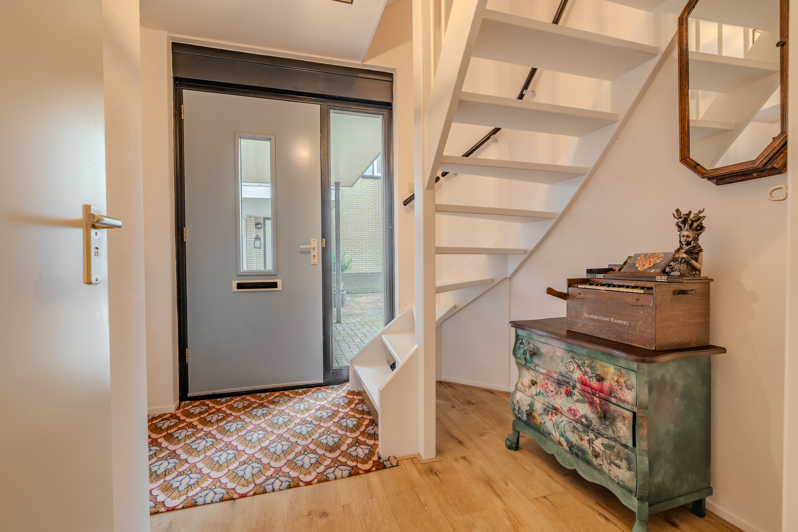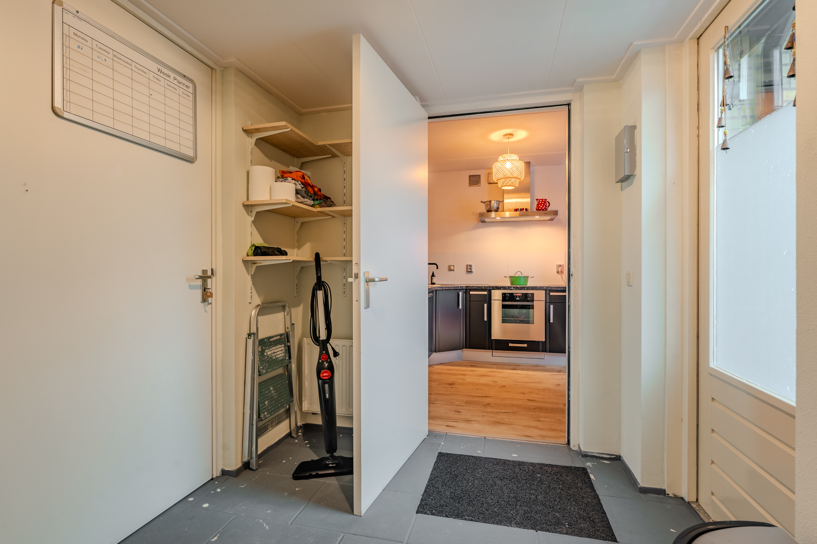 Entree met garderobe nis, vaste open trap naar de eerste verdieping, moderne wc, voorzien van zwevend toilet, fontein en centrale afzuiging, moderne meterkast en toegang tot de royale zonnige woonkamer met openslaande tuindeuren naar het terras, luxe open keuken voorzien van inbouw apparatuur zoals 4-pits inductie kookplaat, oven, afzuigkap, Quooker en vaatwasser, aansluitend de ruime bijkeuken voorzien van witgoedaansluiting, gootsteen en deur naar het terras en toegang naar de voormalige garage omgebouwd naar multifunctionele ruimte voorzien van verwarming, electra, deur naar de tuin en kunststof entree aan de voorzijde.