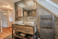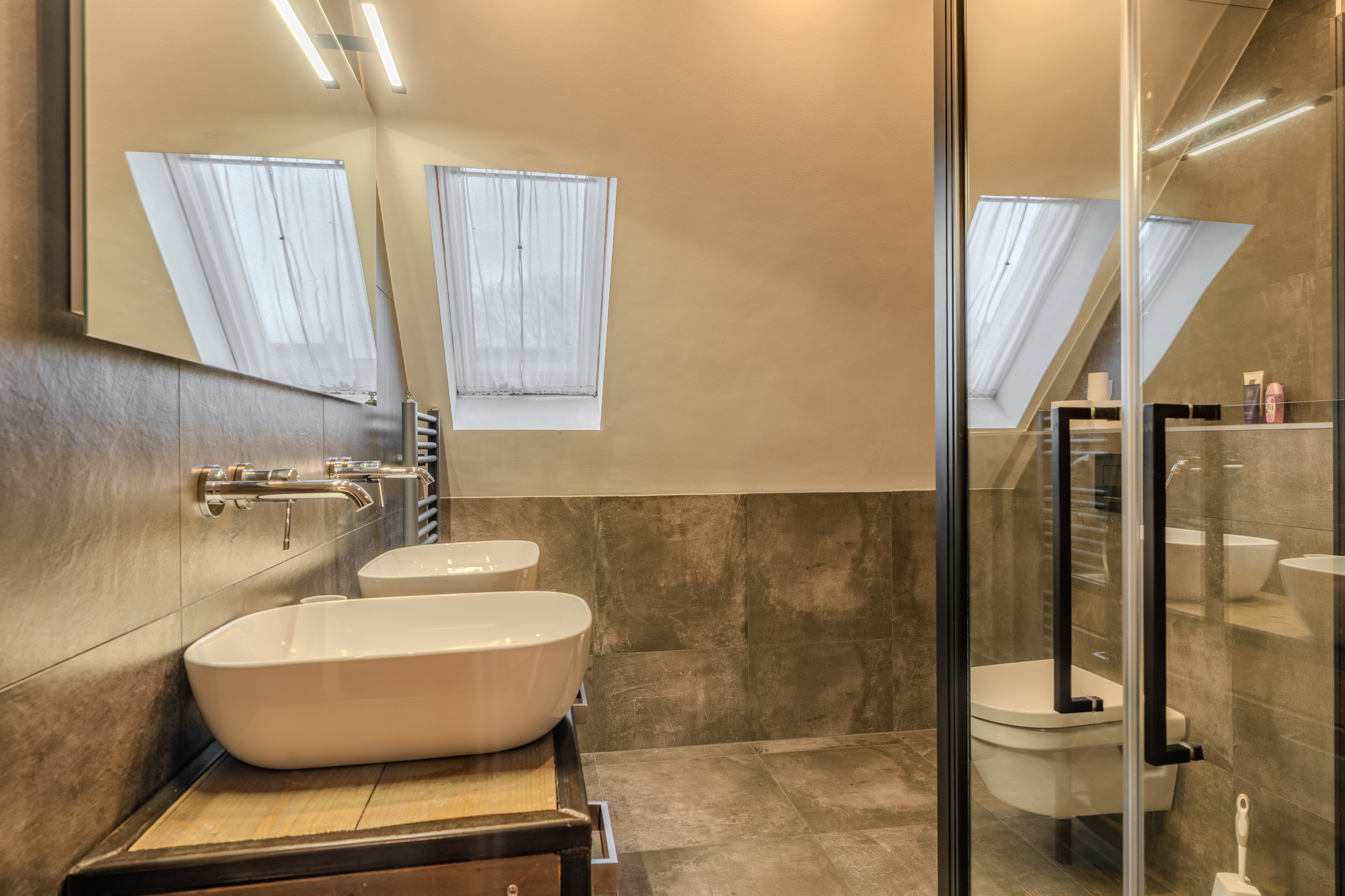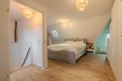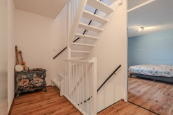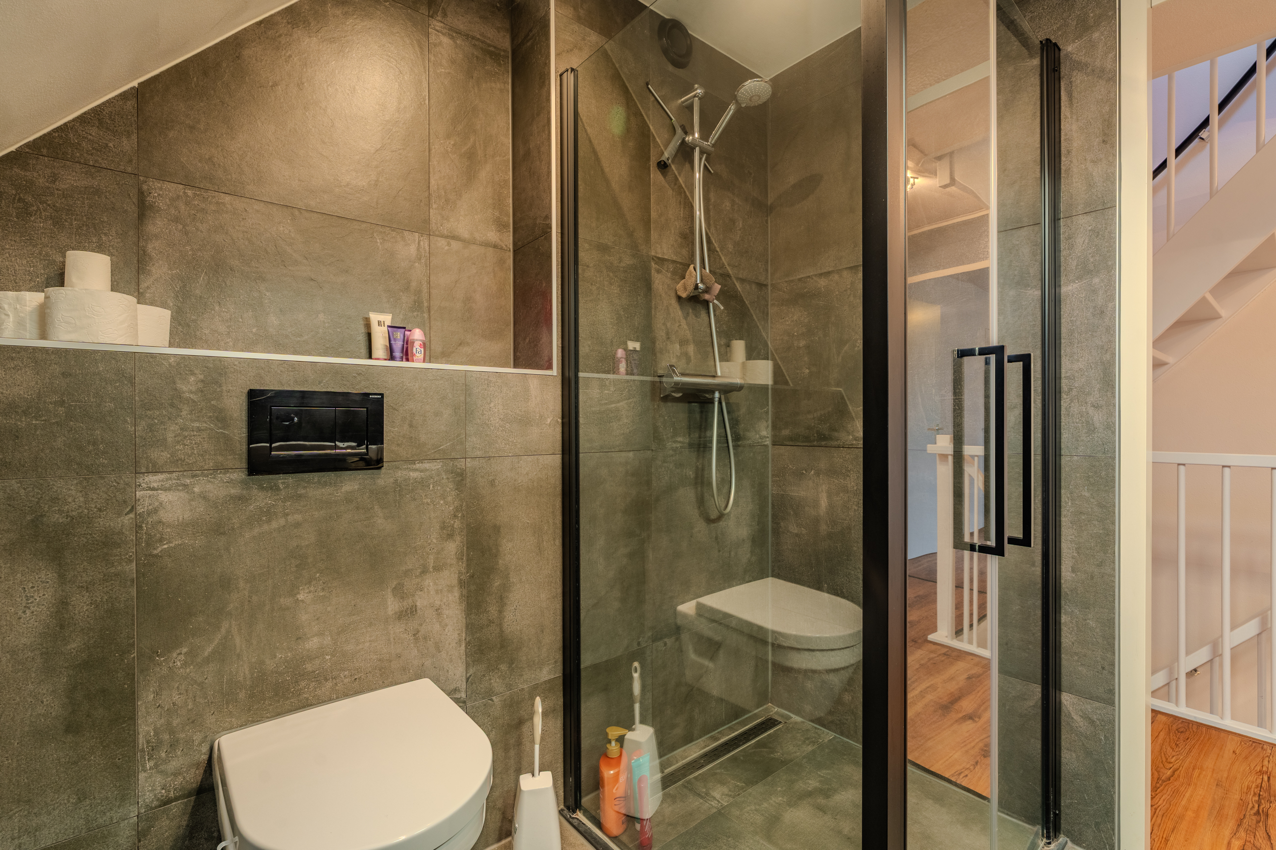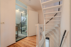 Overloop voorzien van vaste open trap naar de 2e verdieping, drie slaapkamers en moderne badkamer voorzien van zwevend toilet, inloopdouche dubbel wasmeubel, designradiator en centrale afzuiging.